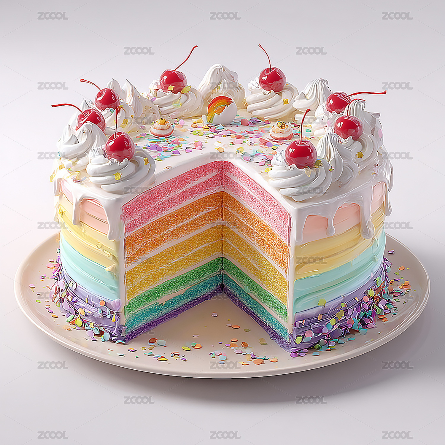 彩虹蛋糕,多层蛋糕,奶油,樱桃,彩色糖屑,甜品,生日蛋糕,节日蛋糕