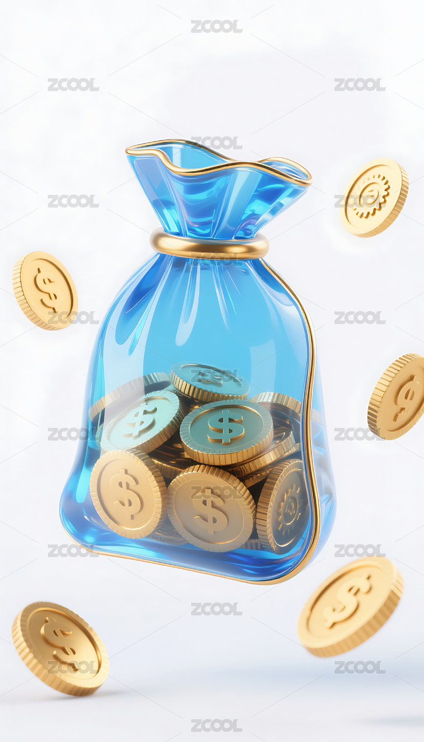 3D,透明,钱袋,金币,模型,电商,蓝色