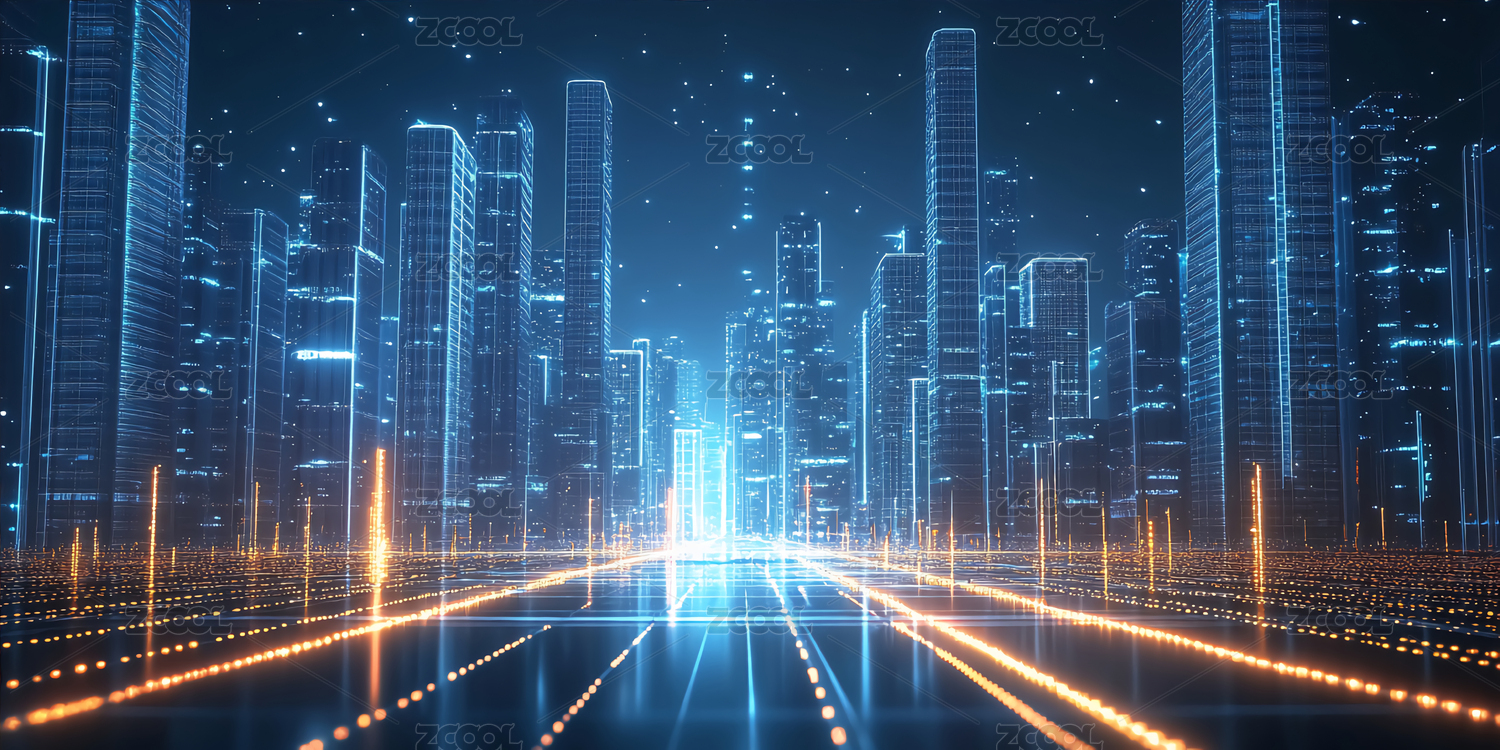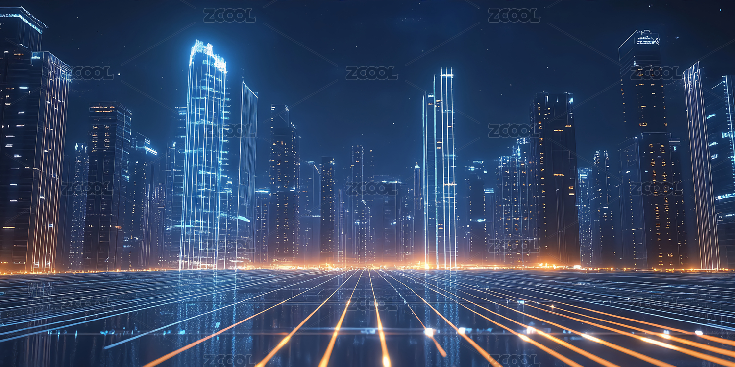 现代城市建筑蓝灯3D技术摩天大楼智能数据
