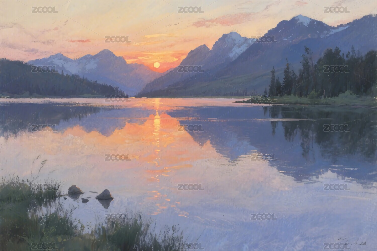 湖泊日落山水画