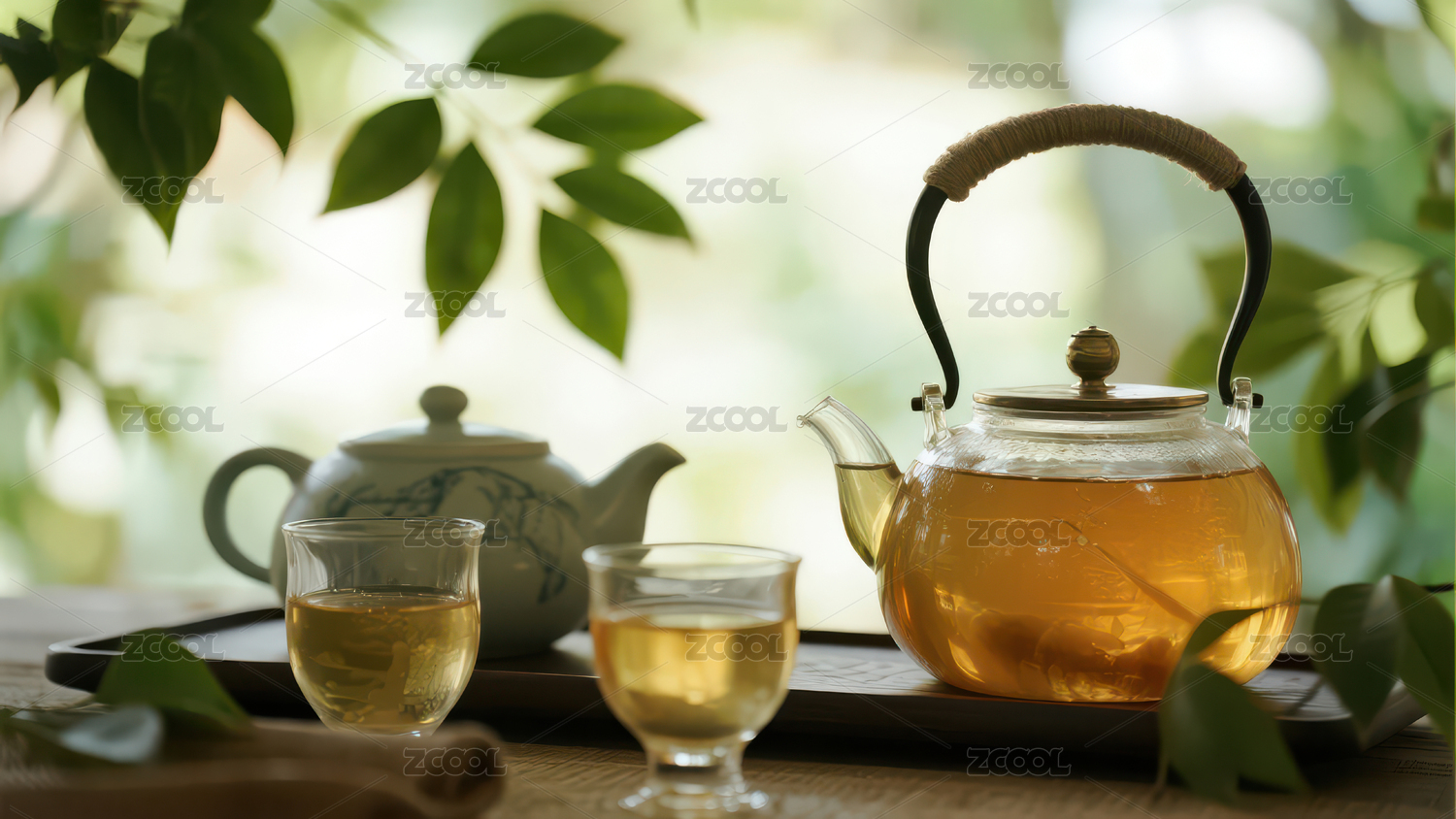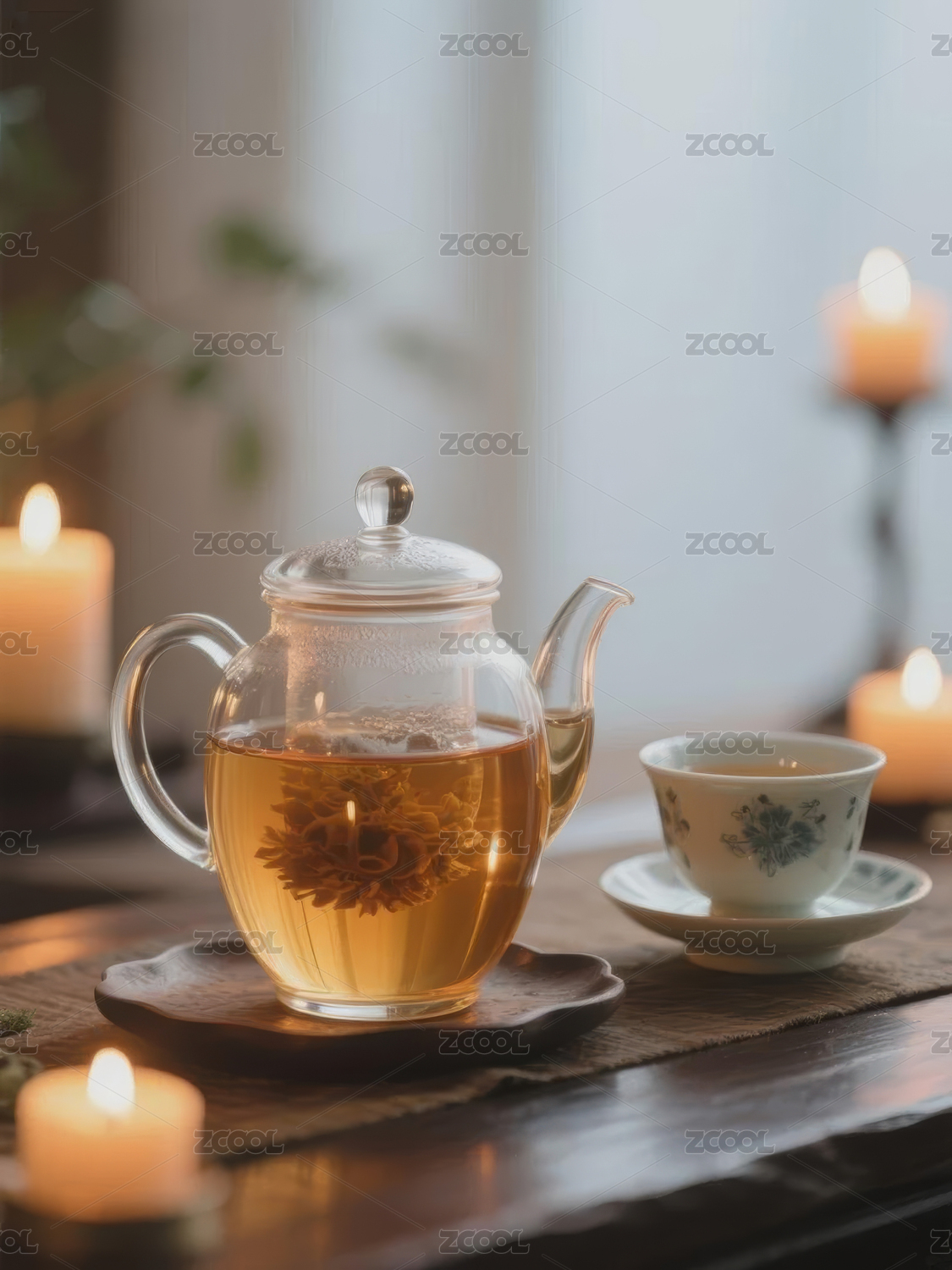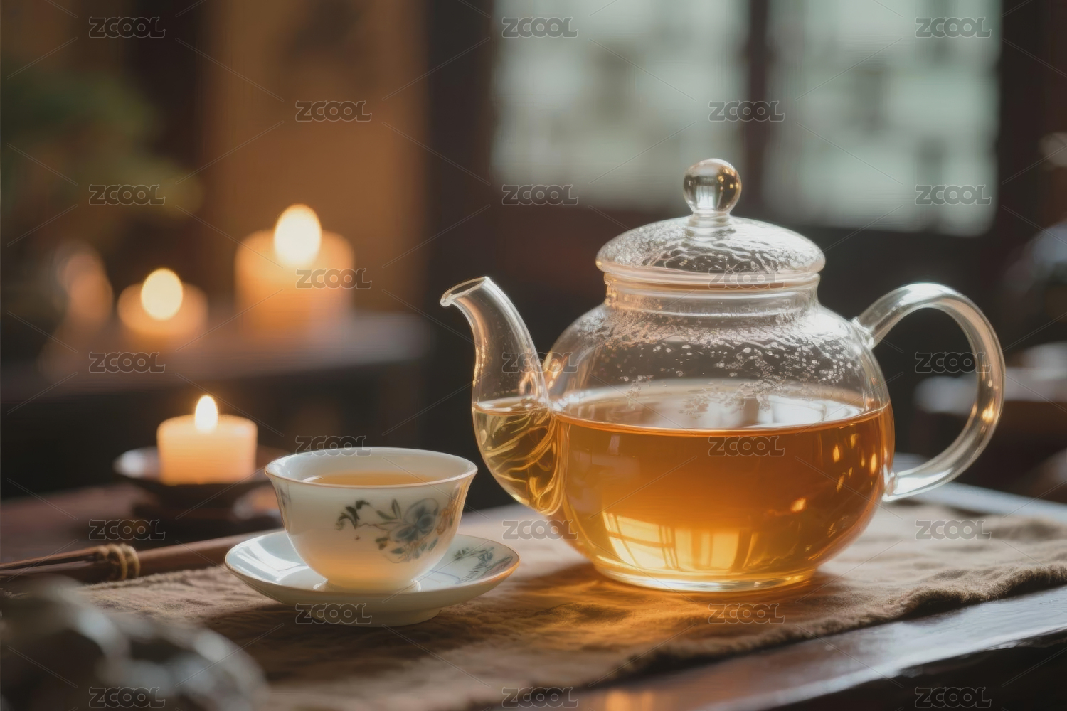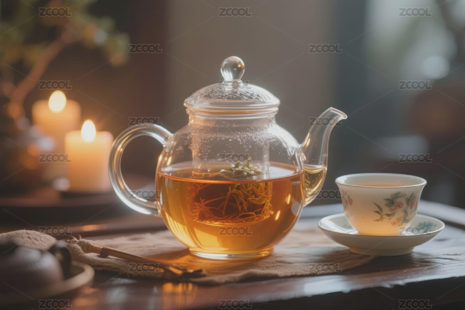 透明, 木桌, 蒸汽, 宁静, 玻璃, 温暖, 灯光,茶壶, 茶杯, 茶叶