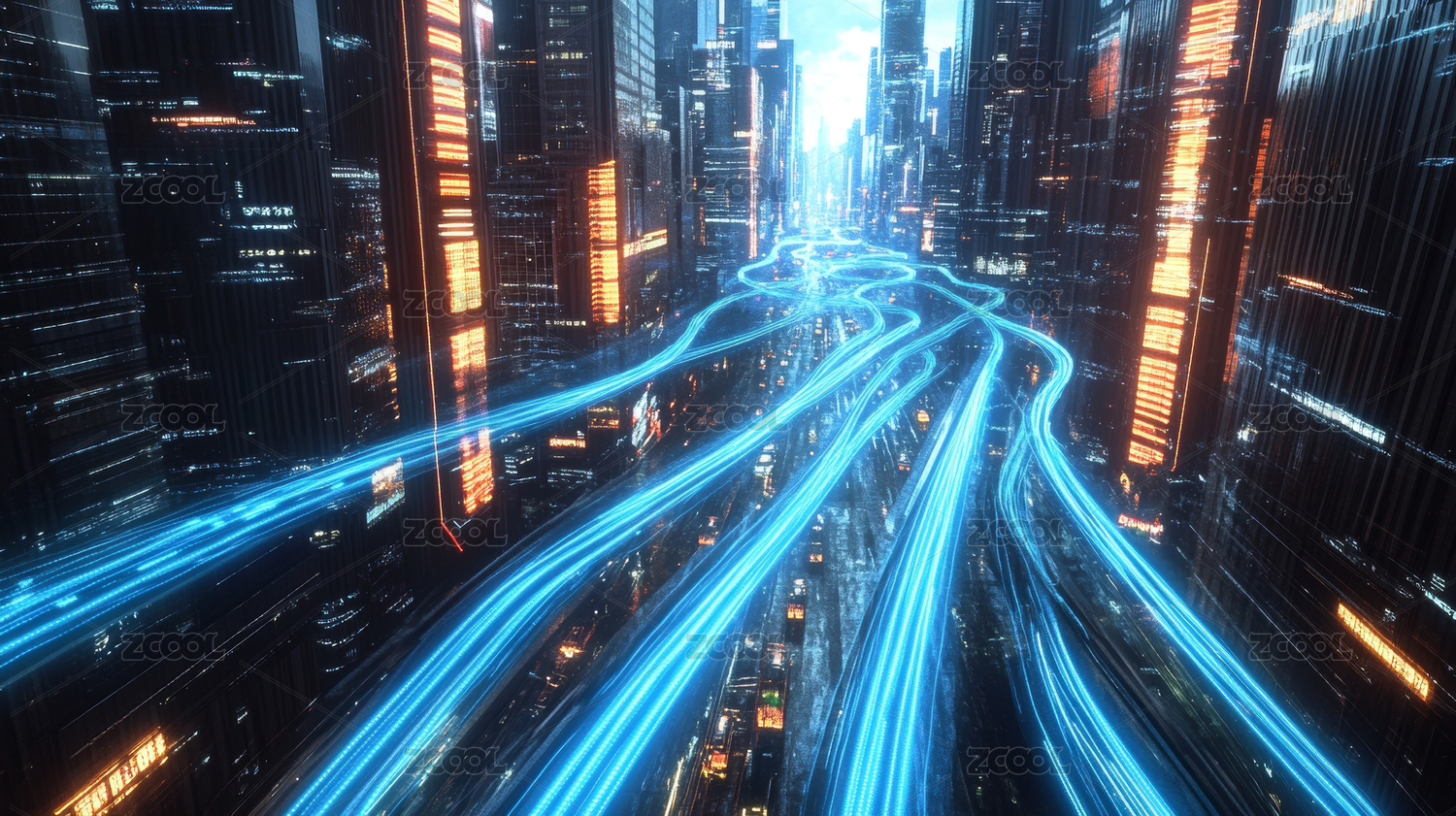 未来城市夜空蓝光交织