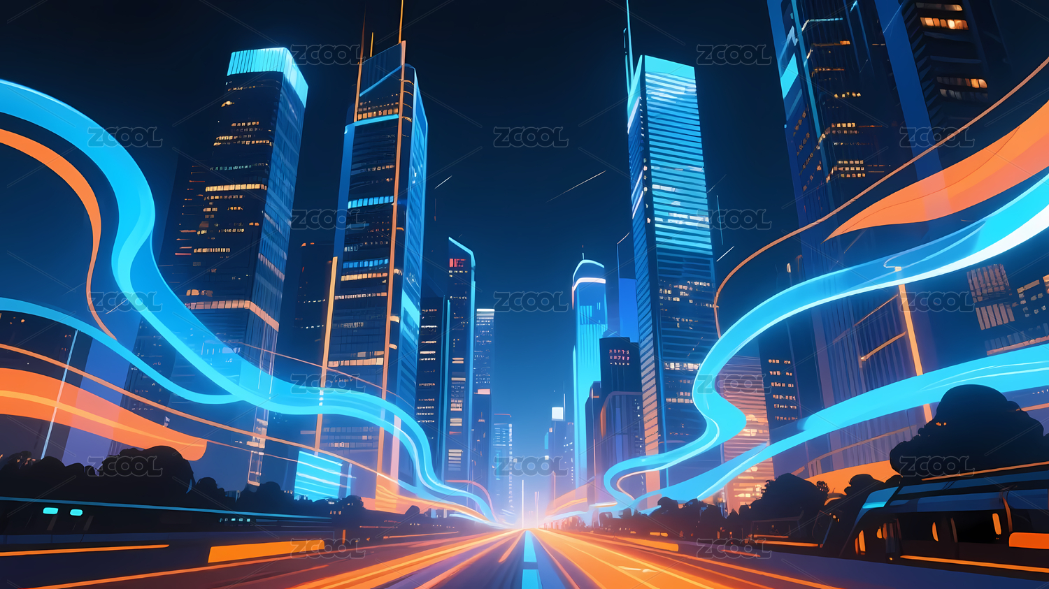 现代夜景高楼蓝橙灯光