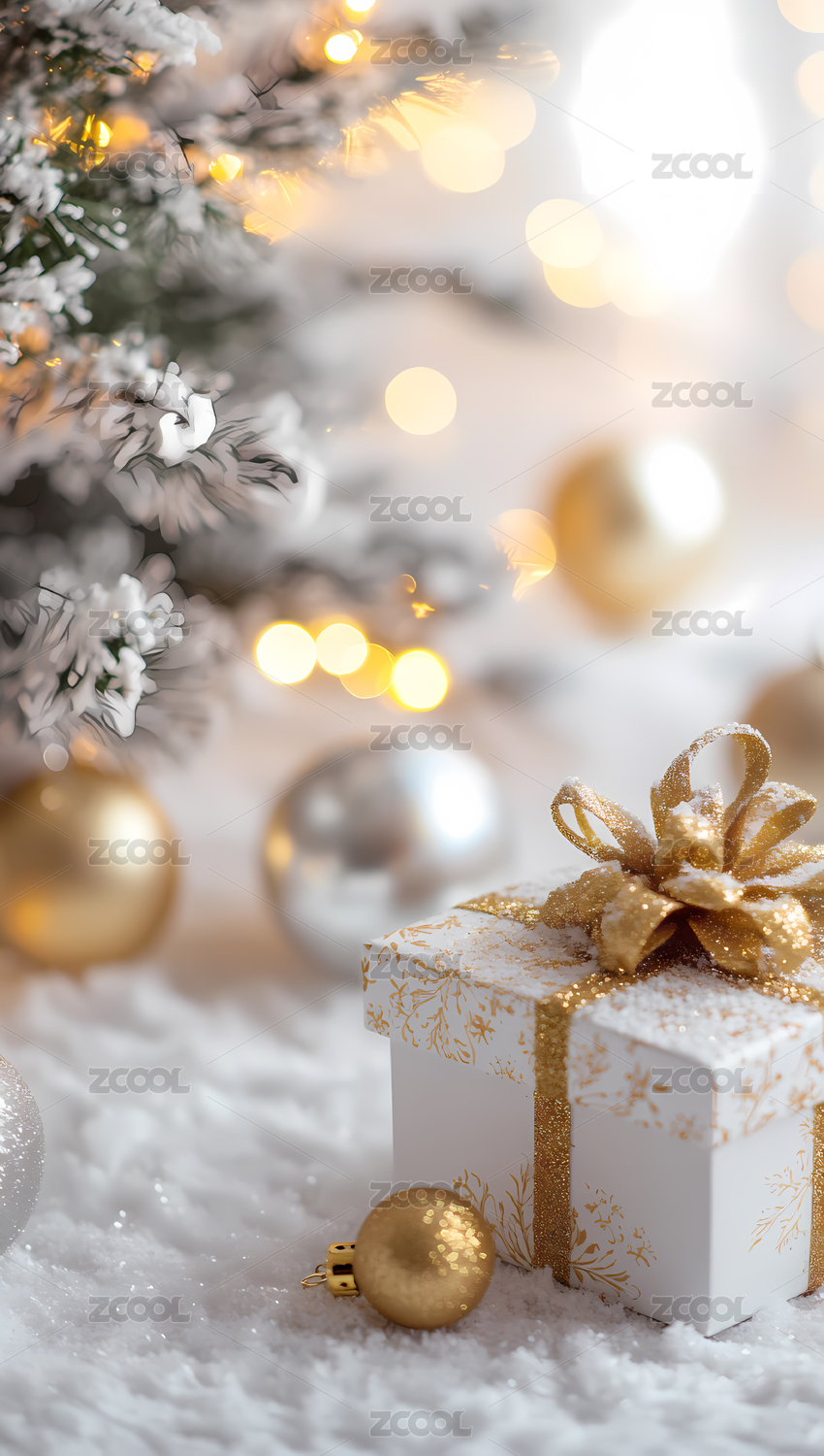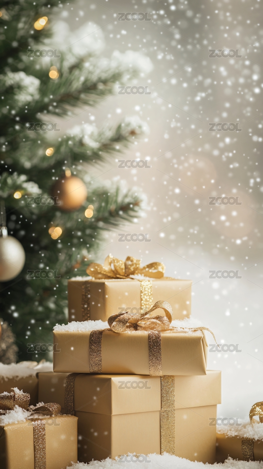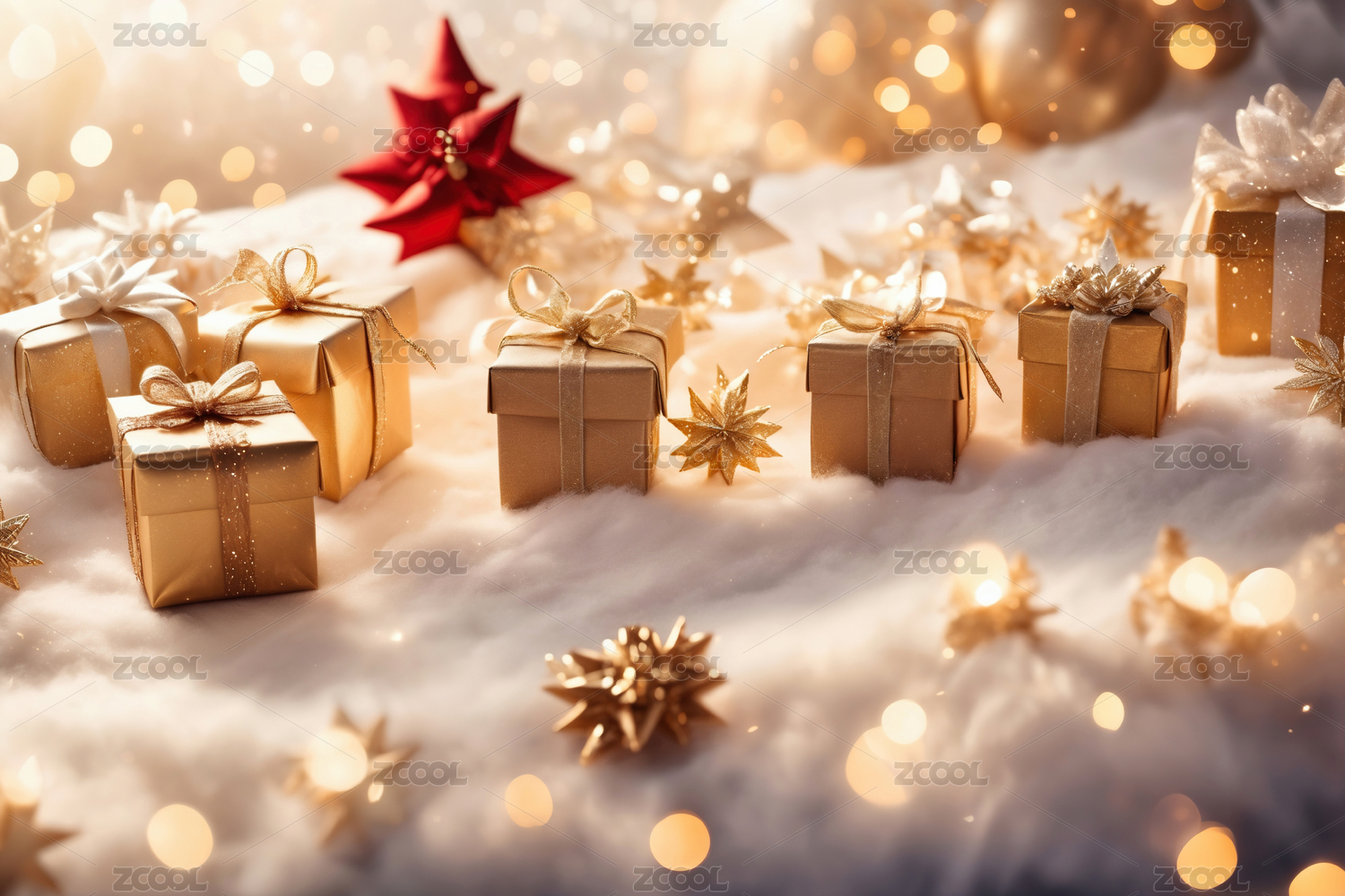礼物, 金色, 圣诞, 树, 节日, 装饰, 灯光, 星星, 雪, 冬季