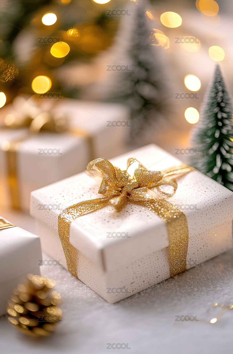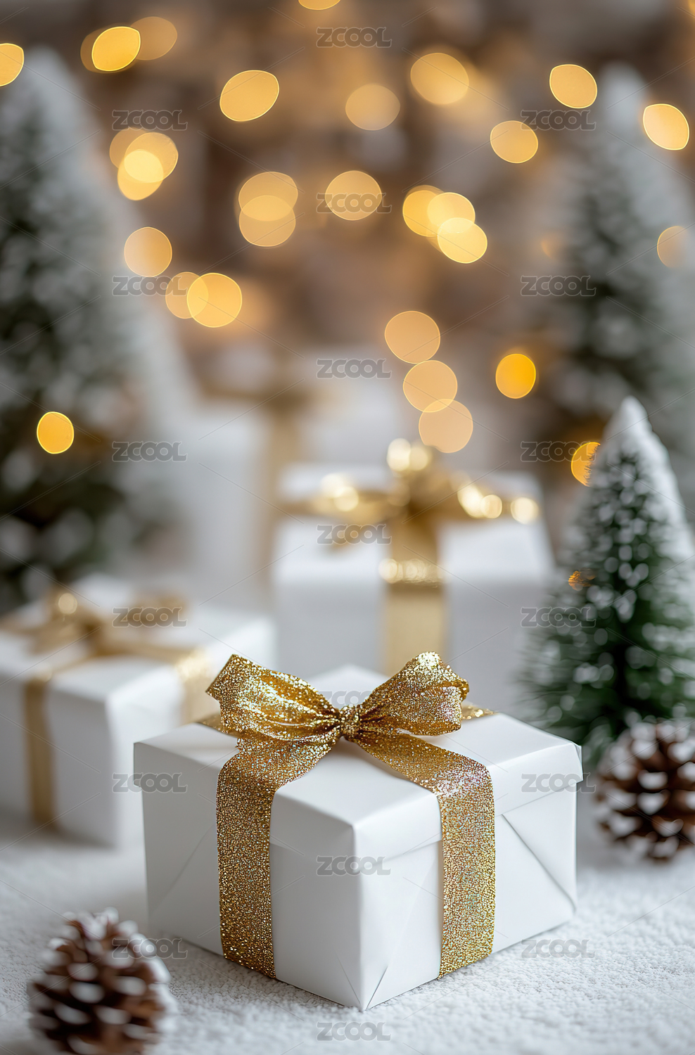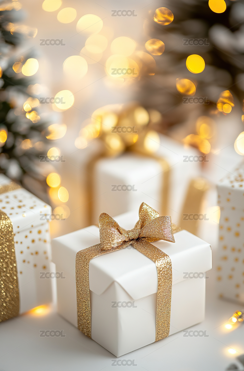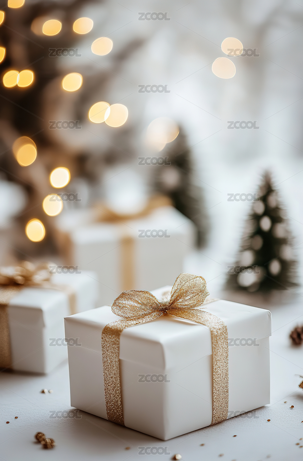礼物, 金色, 圣诞, 树, 节日, 装饰, 灯光, 星星, 雪, 冬季
