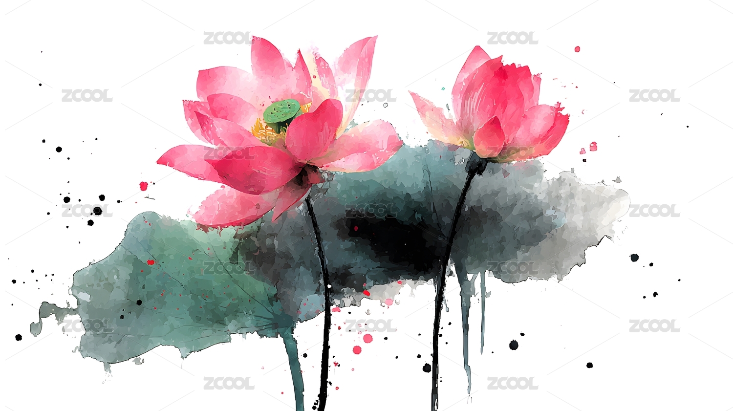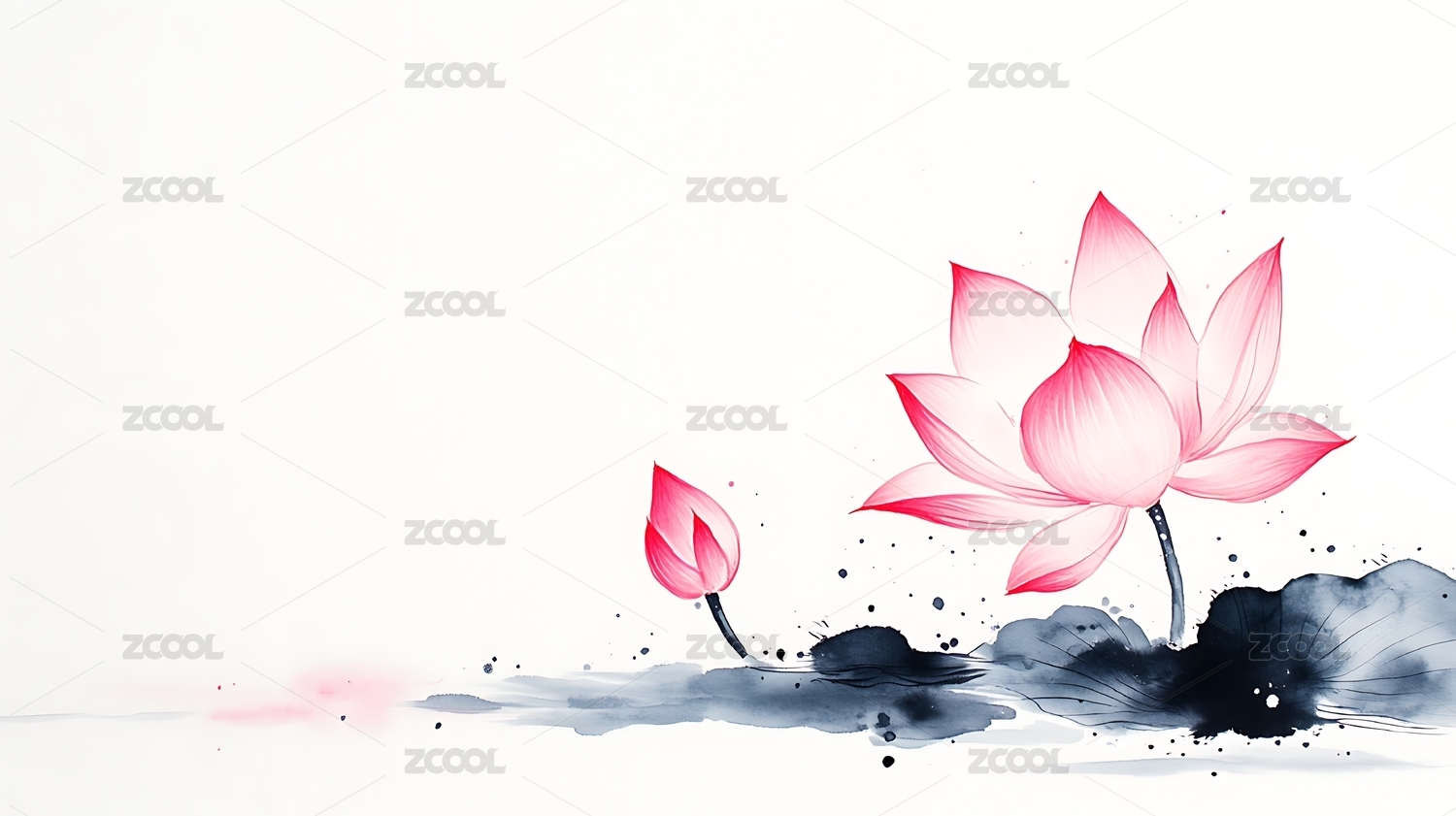 水墨风格两朵盛开的粉色荷花