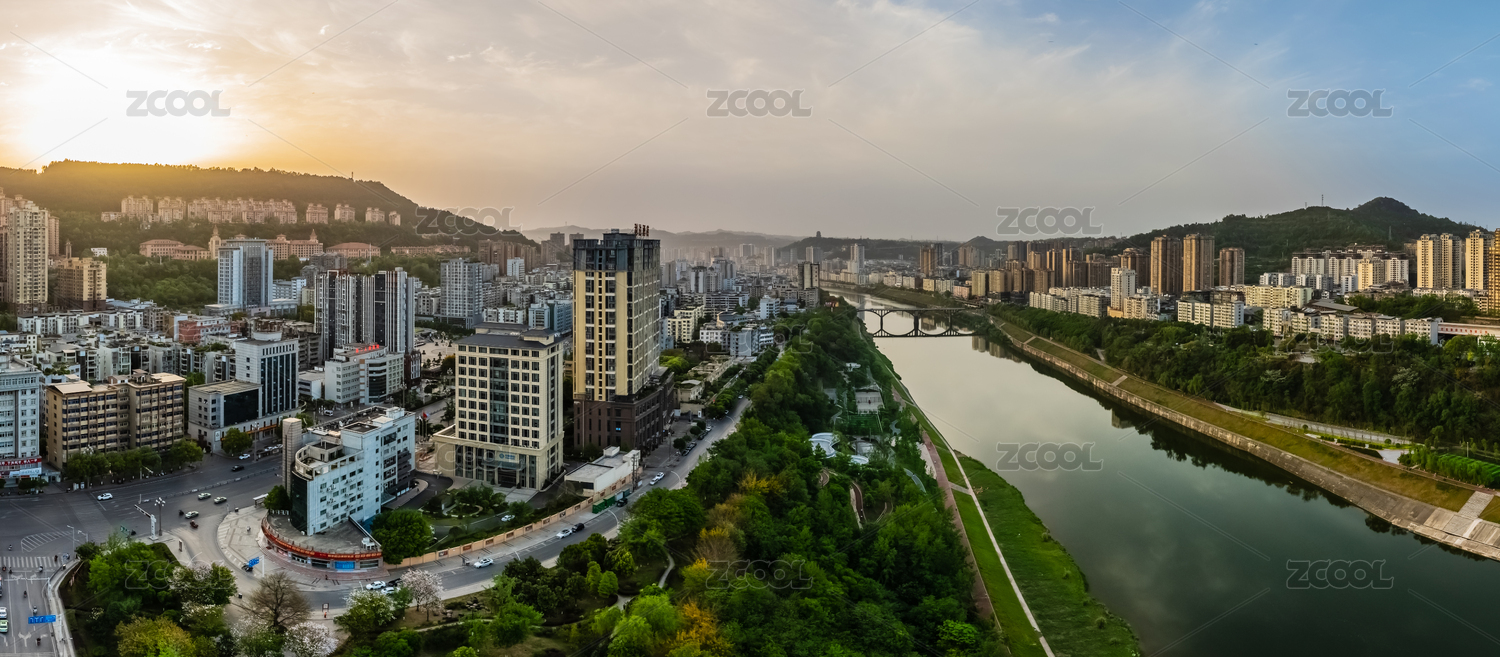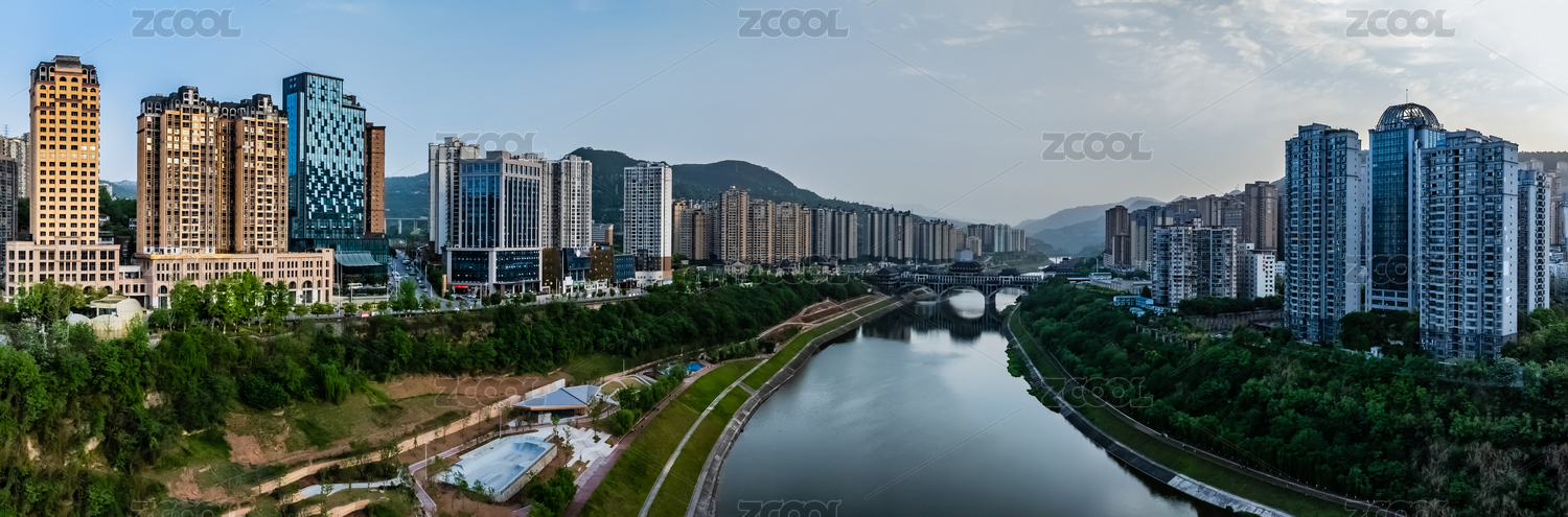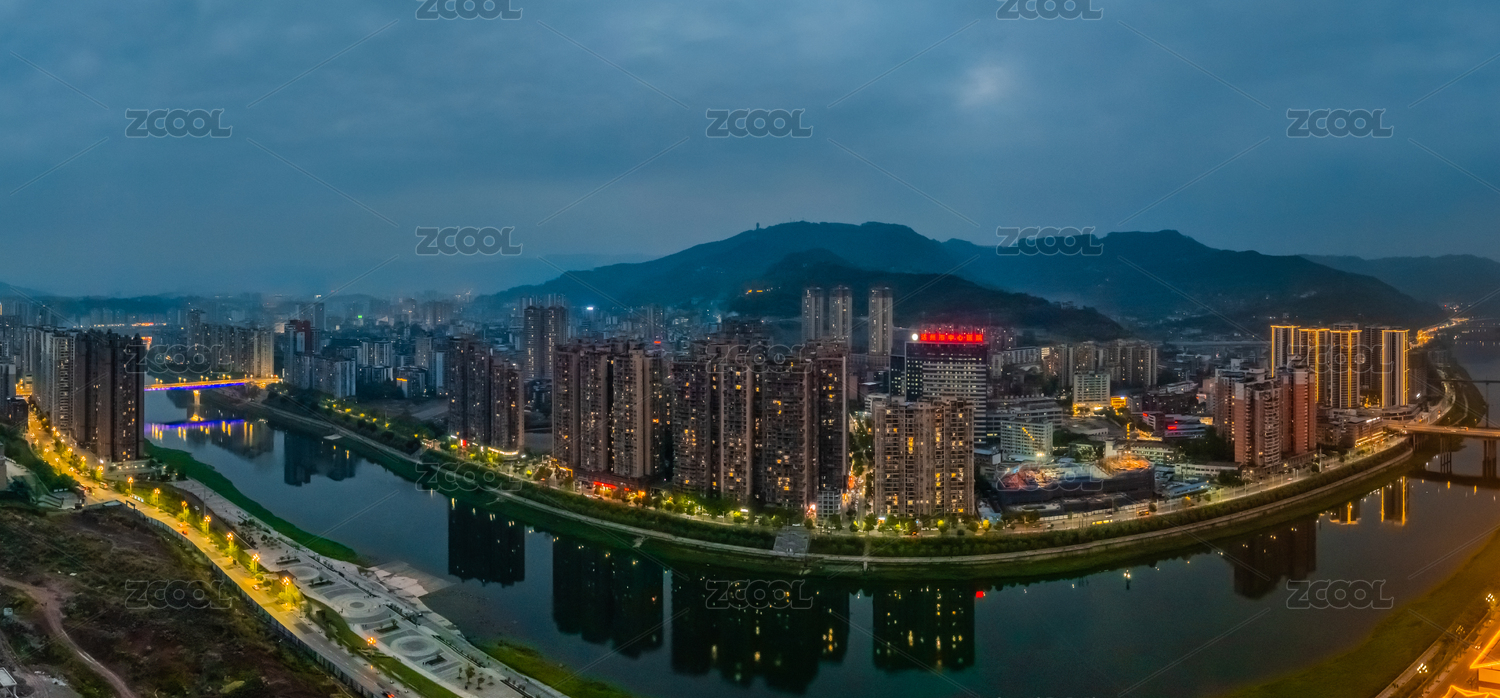 中国四川省巴中市城区黄昏巴河外滩高楼建筑