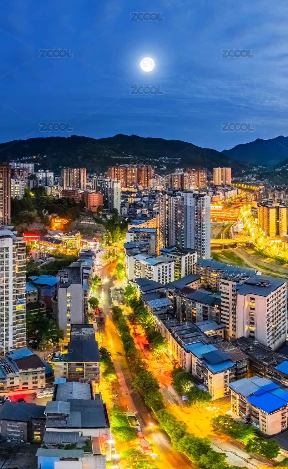 中国四川省万源市夜晚月亮城区高楼大厦建筑