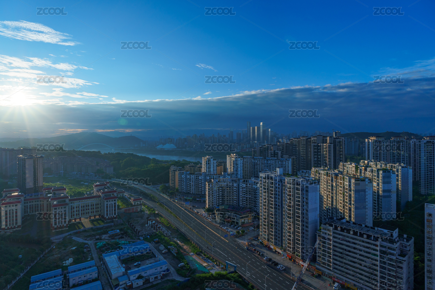 广西南宁柳沙半岛城市公路与清晨日出云彩