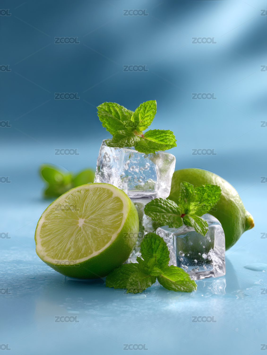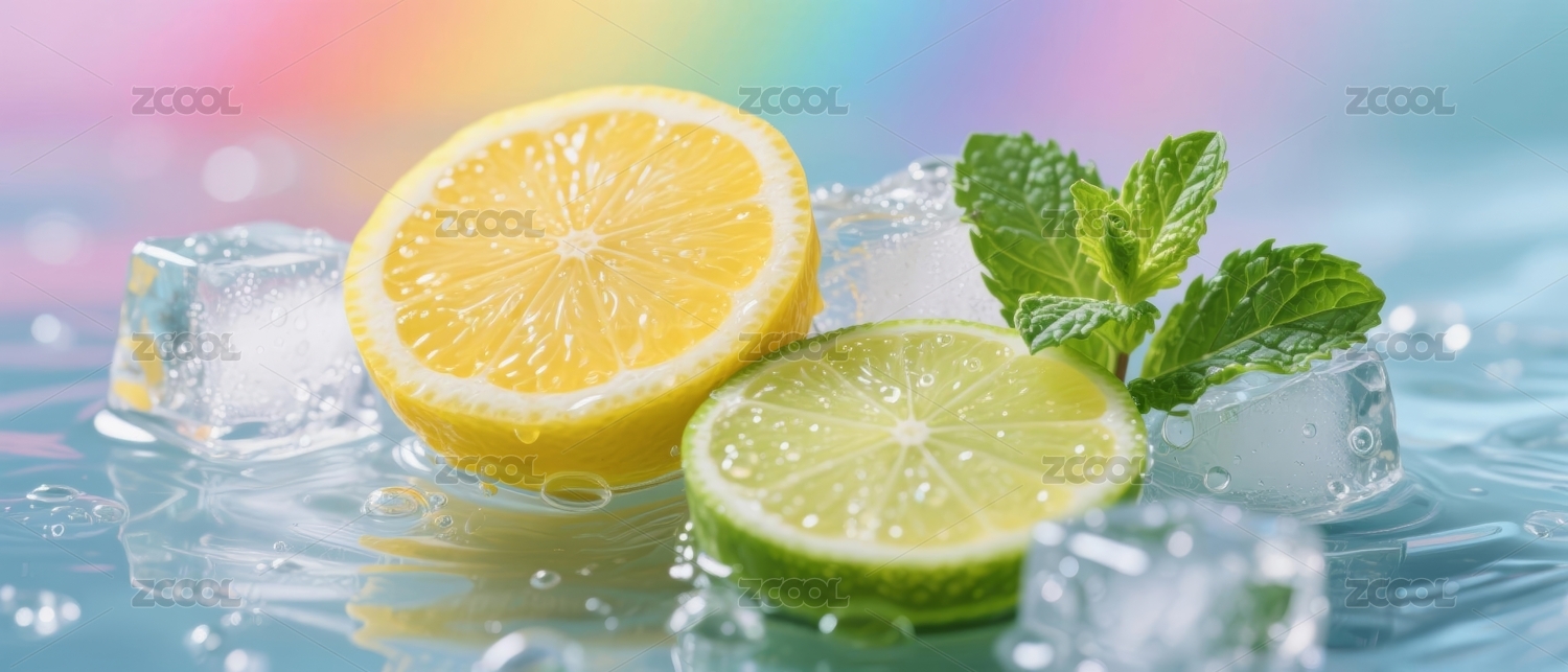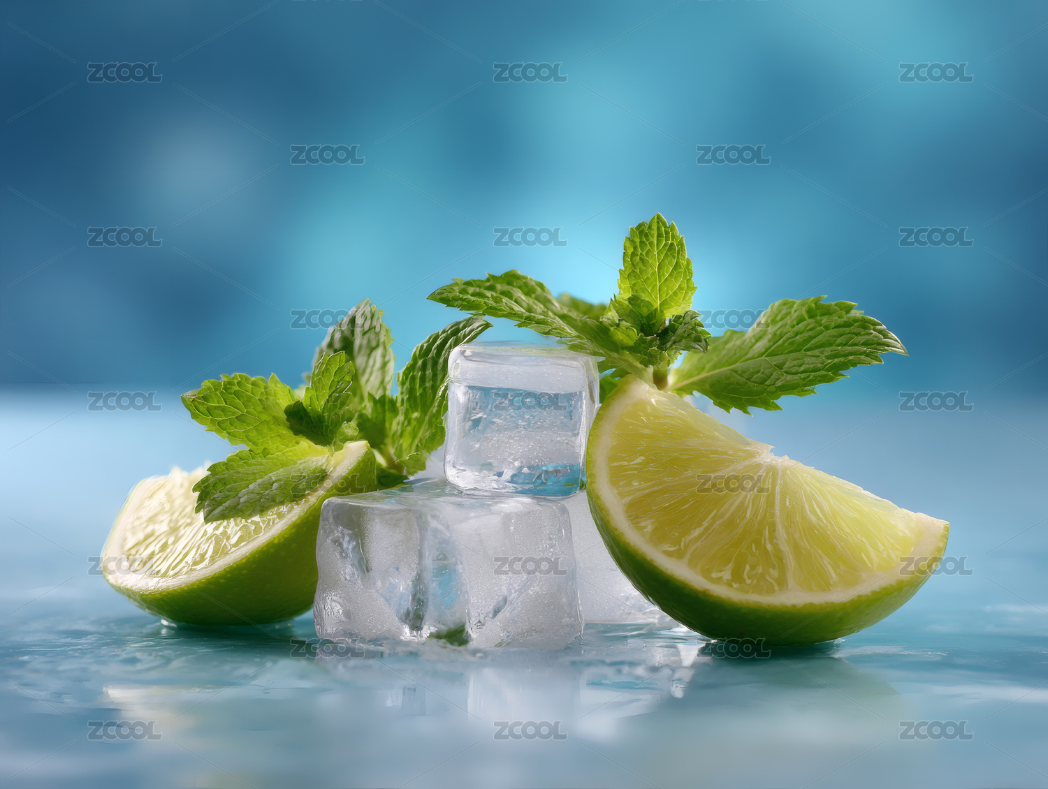 主视觉,清凉,冰块,水花,水果,饮品,背景,柠檬,场景,蓝色