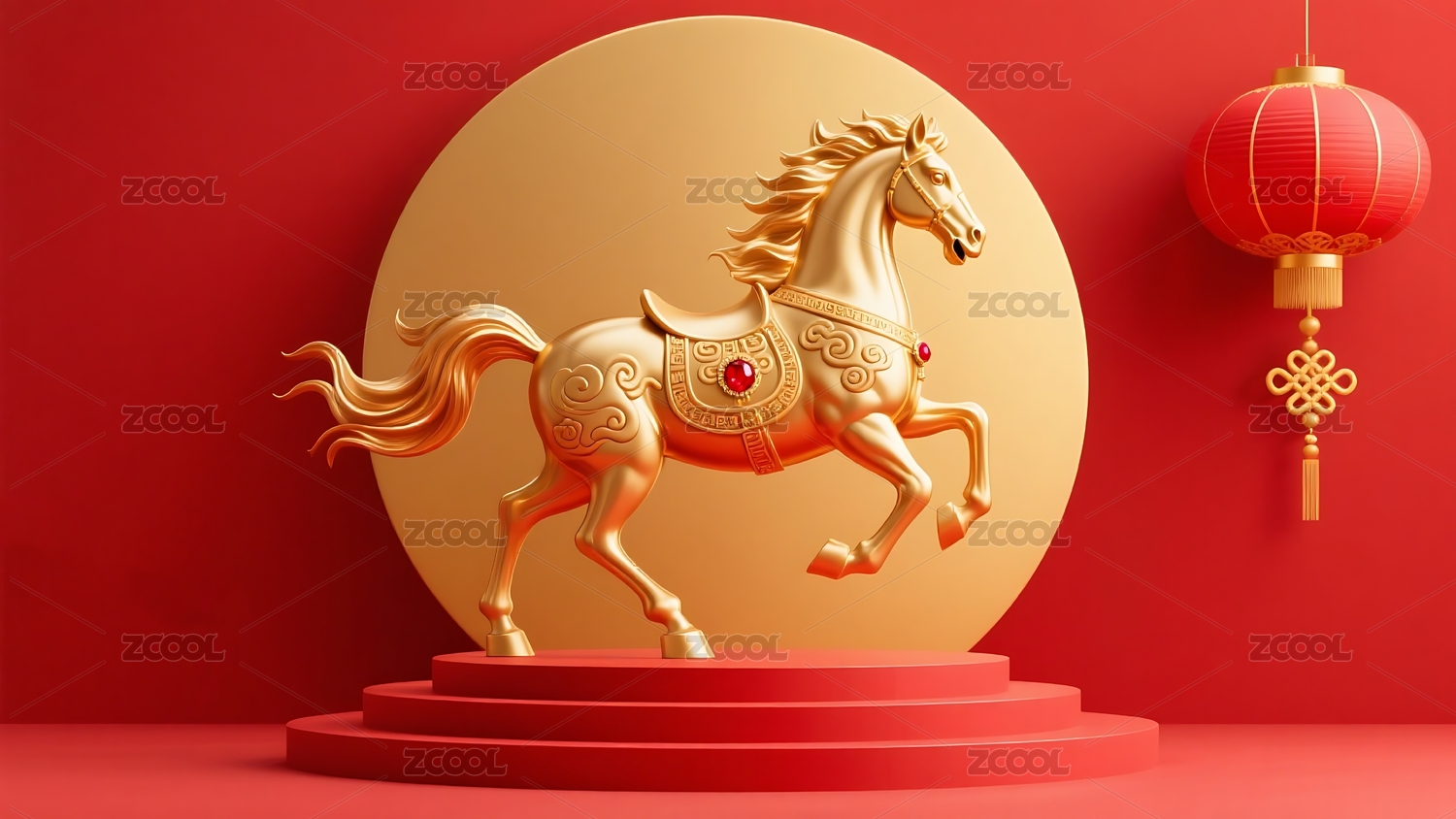 红色背景金色骏马与灯笼装饰