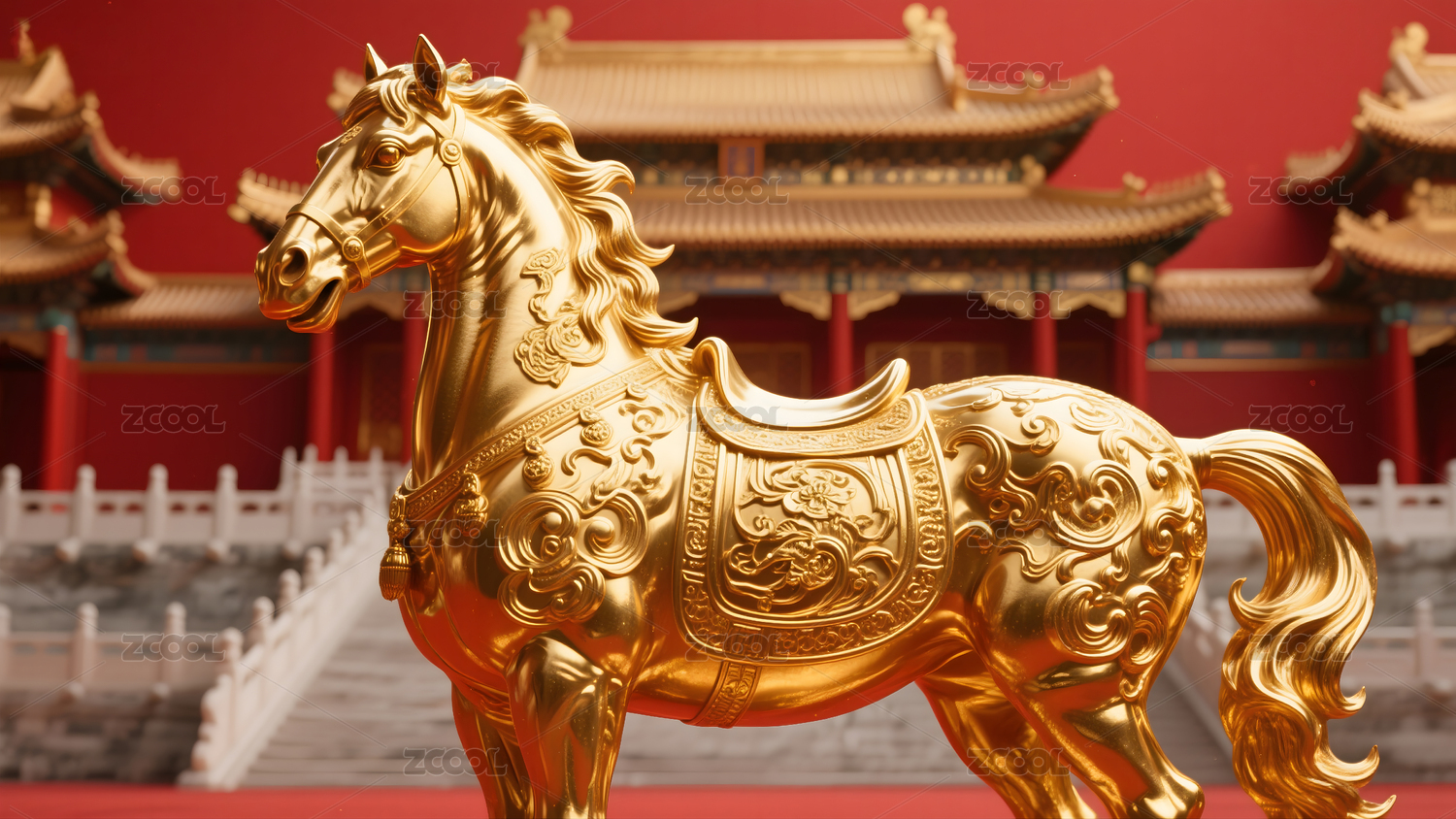 金色马雕塑与红色背景