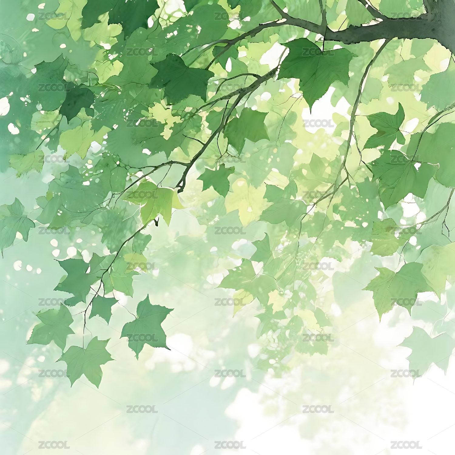 绿叶,树枝,光影,水彩,清新,自然,肌理,透亮,生机,静谧