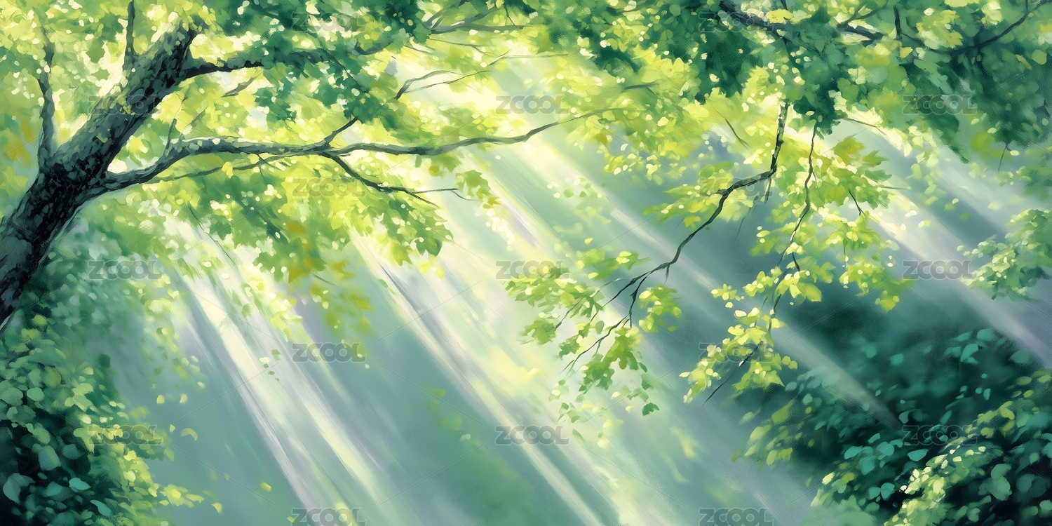 唯美森林里的阳光手绘插画