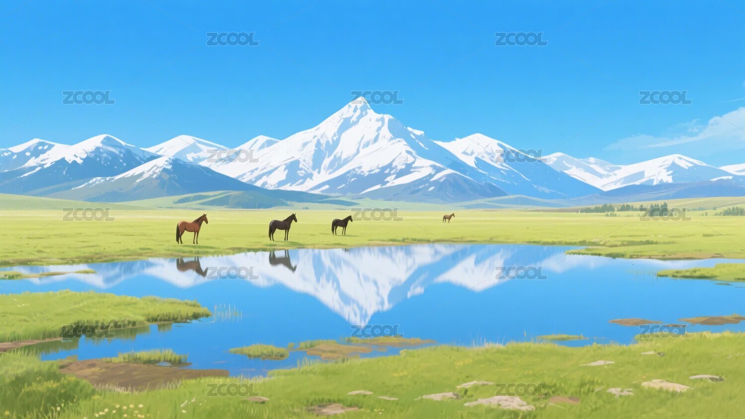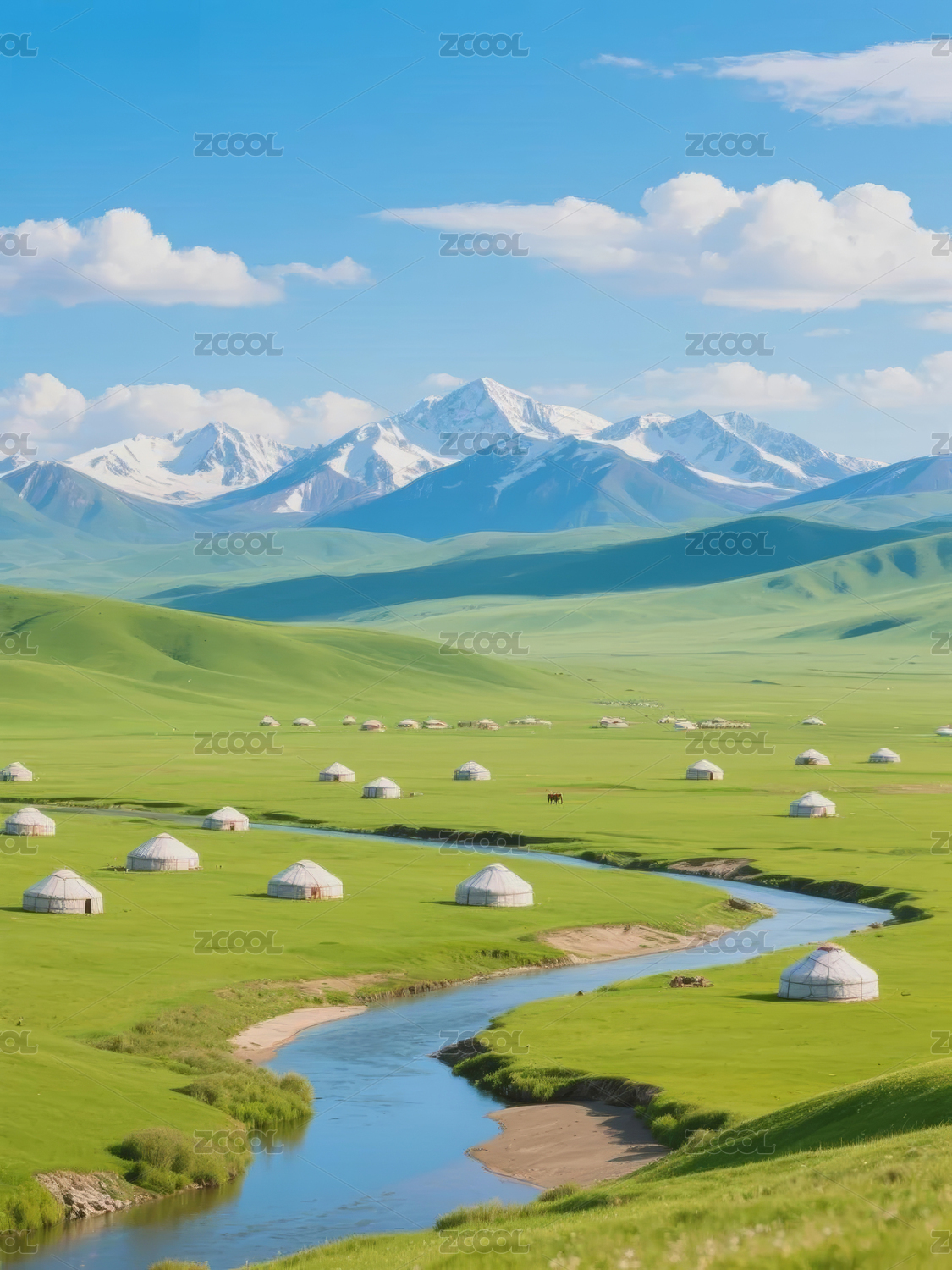 蓝天白云、雪山草原和近处的蒙古包和羊群
