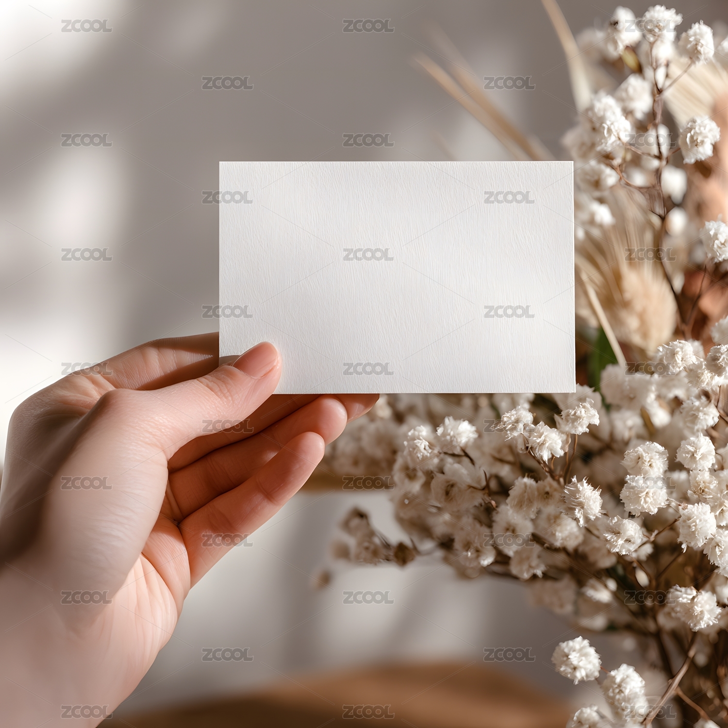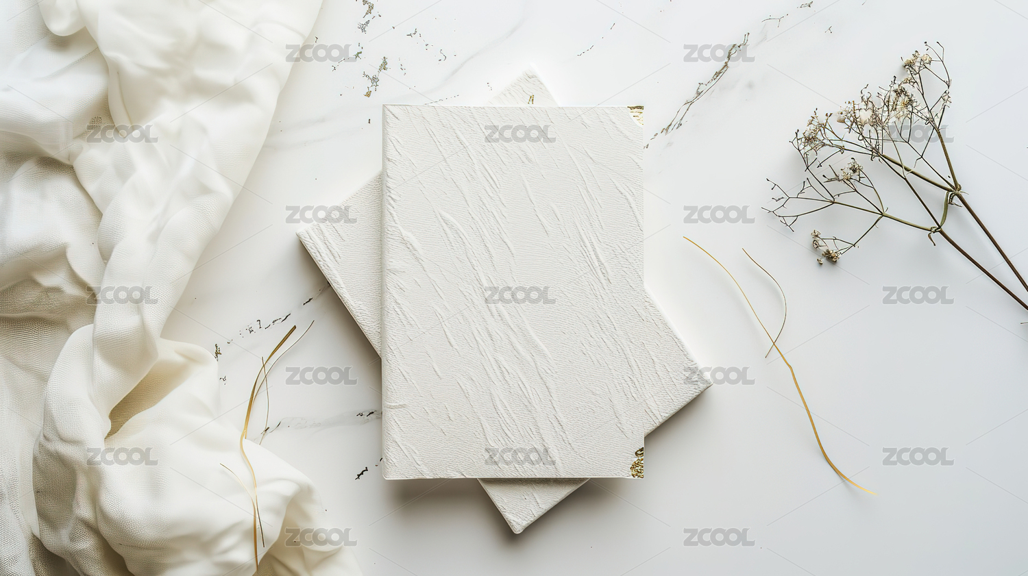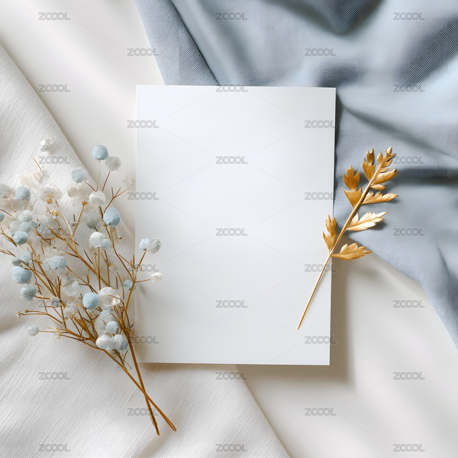 浅蓝布上白色卡片与干花静物摄影高清图片