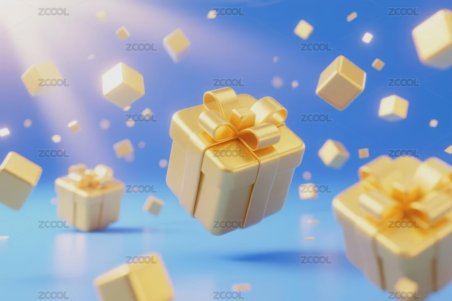 白色礼品盒金色丝带在空中飘浮的金色碎片