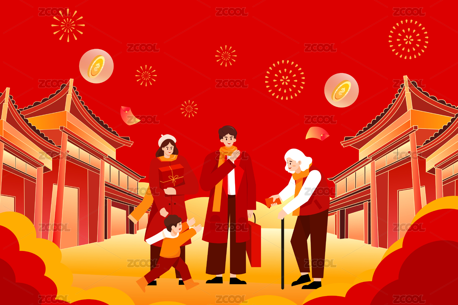 春节回家过年家人团圆国潮建筑矢量插画