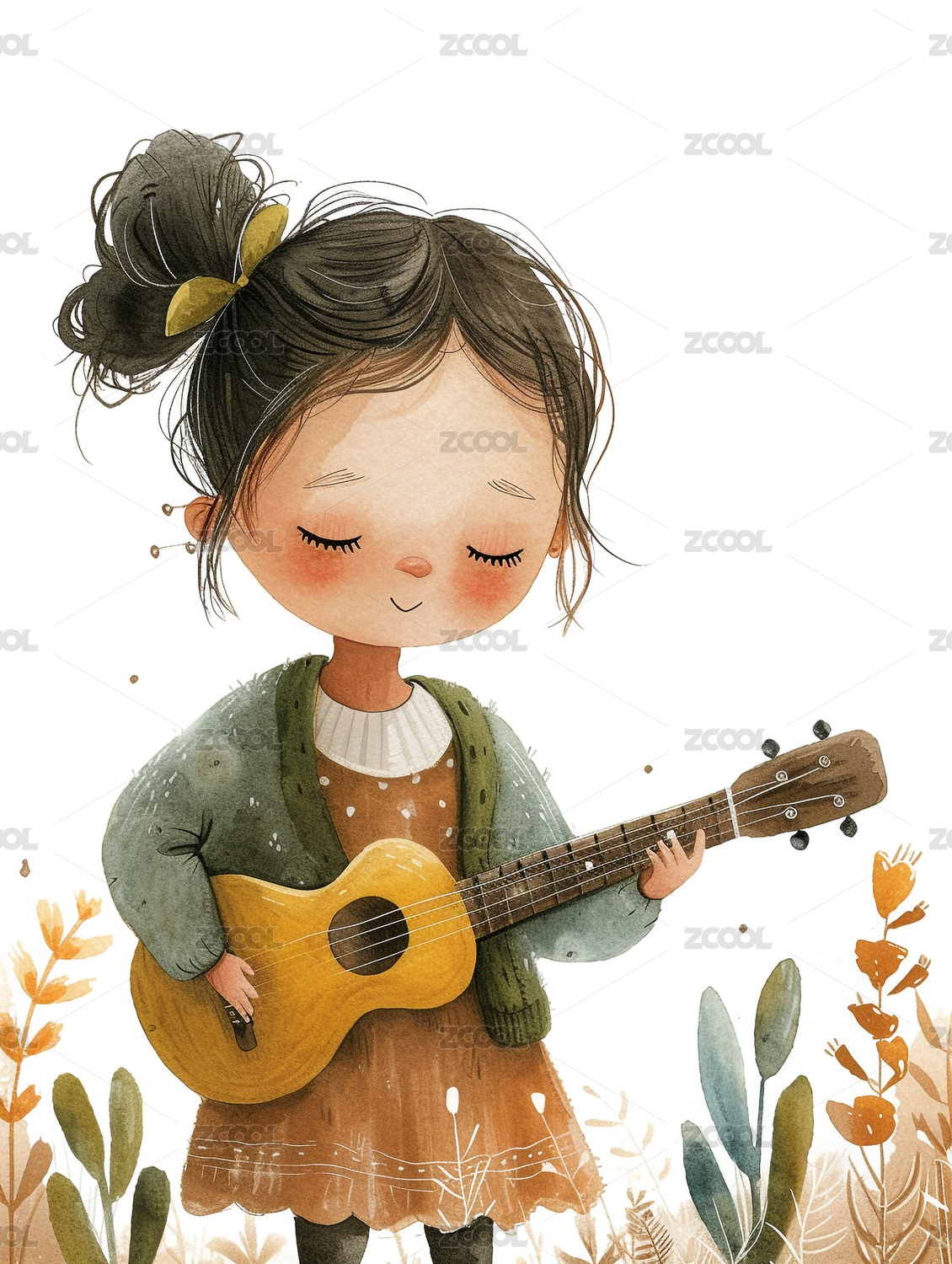 可爱卡通女孩弹奏尤克里里,温馨插画风格,
