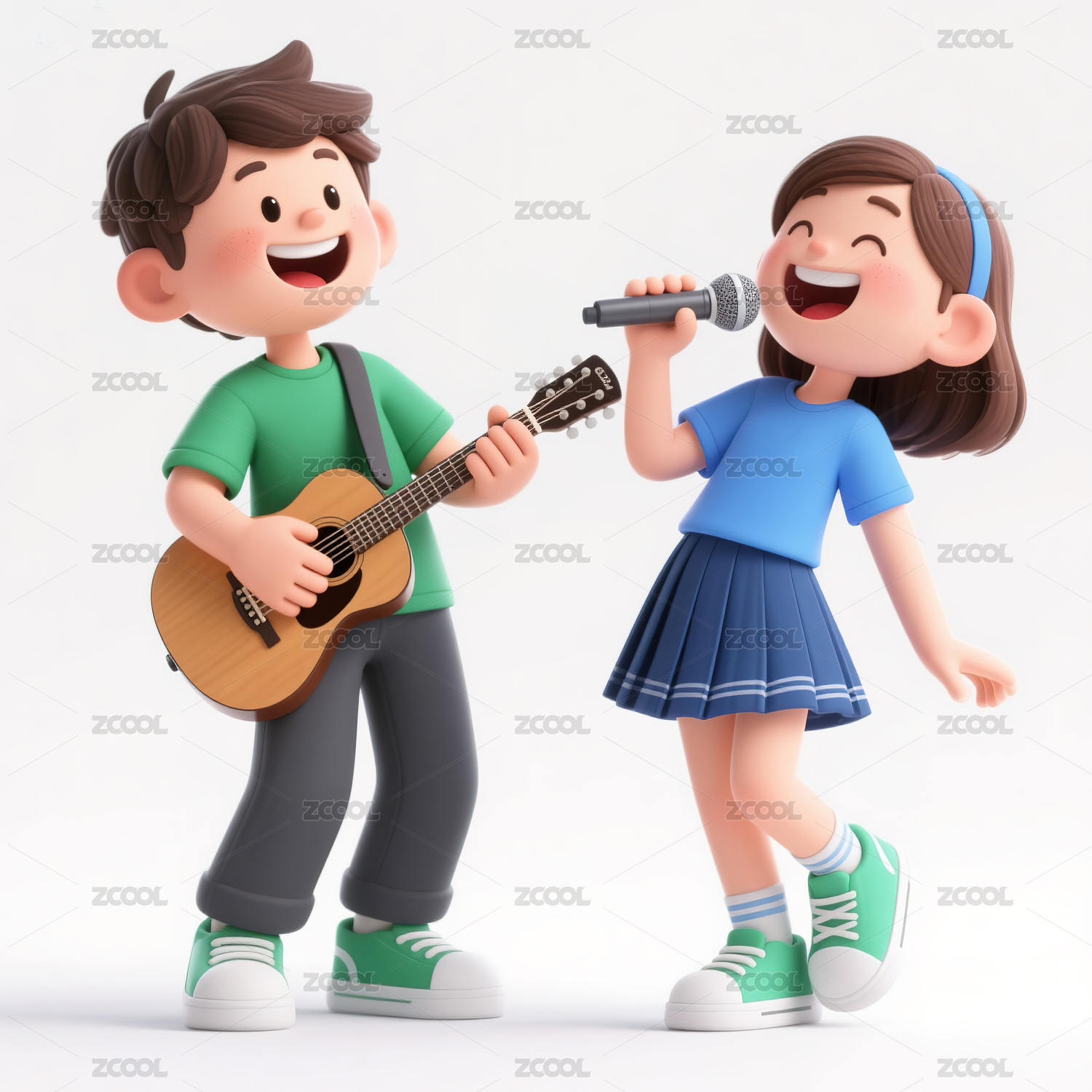 弹吉他的男孩和唱歌的女孩3d插画