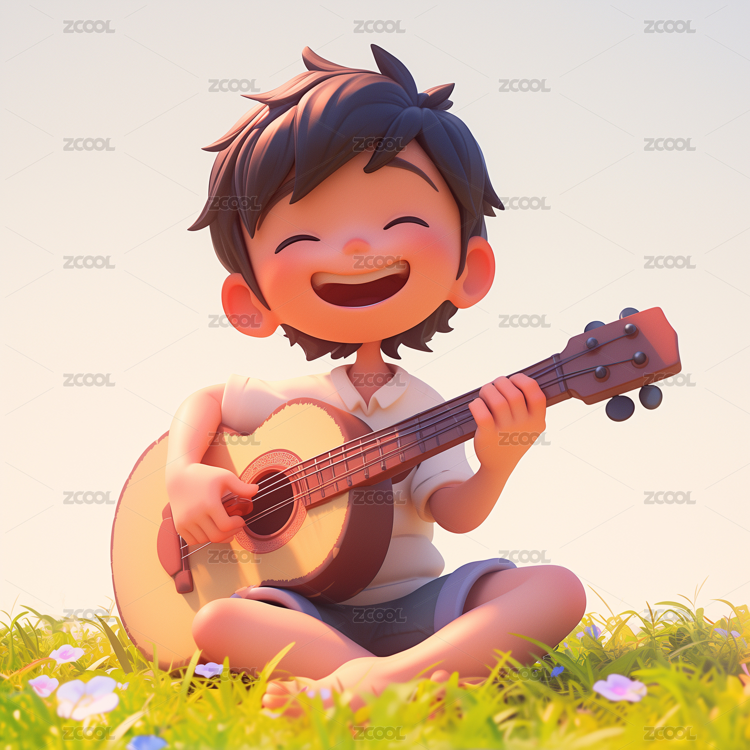 3D卡通坐在草坪上的男孩弹吉他