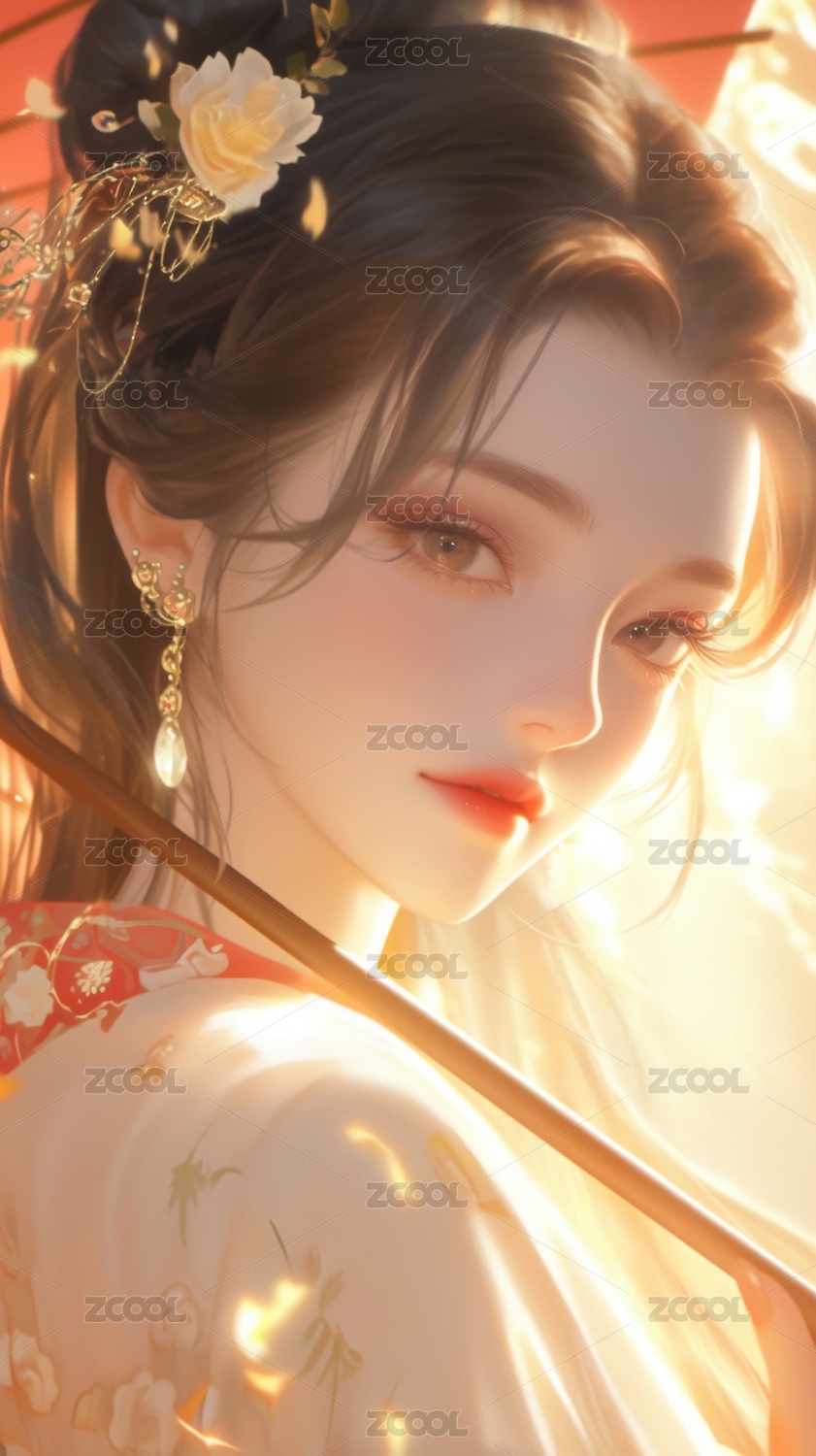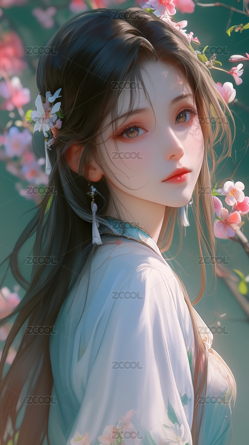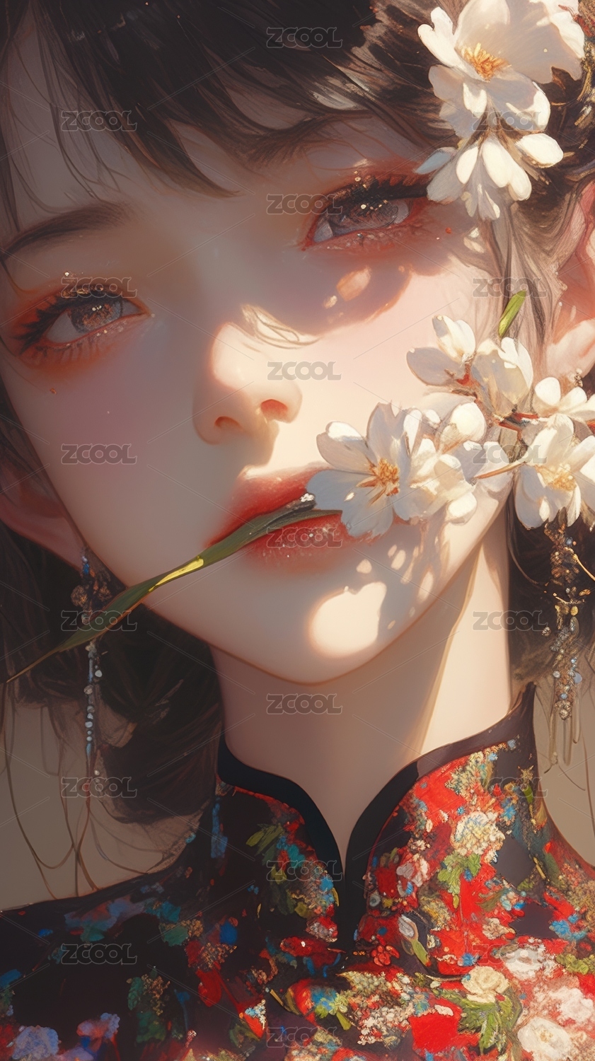 女子,插画,卡通,漫画,耳环,花卉,背景,服饰,细腻,白花