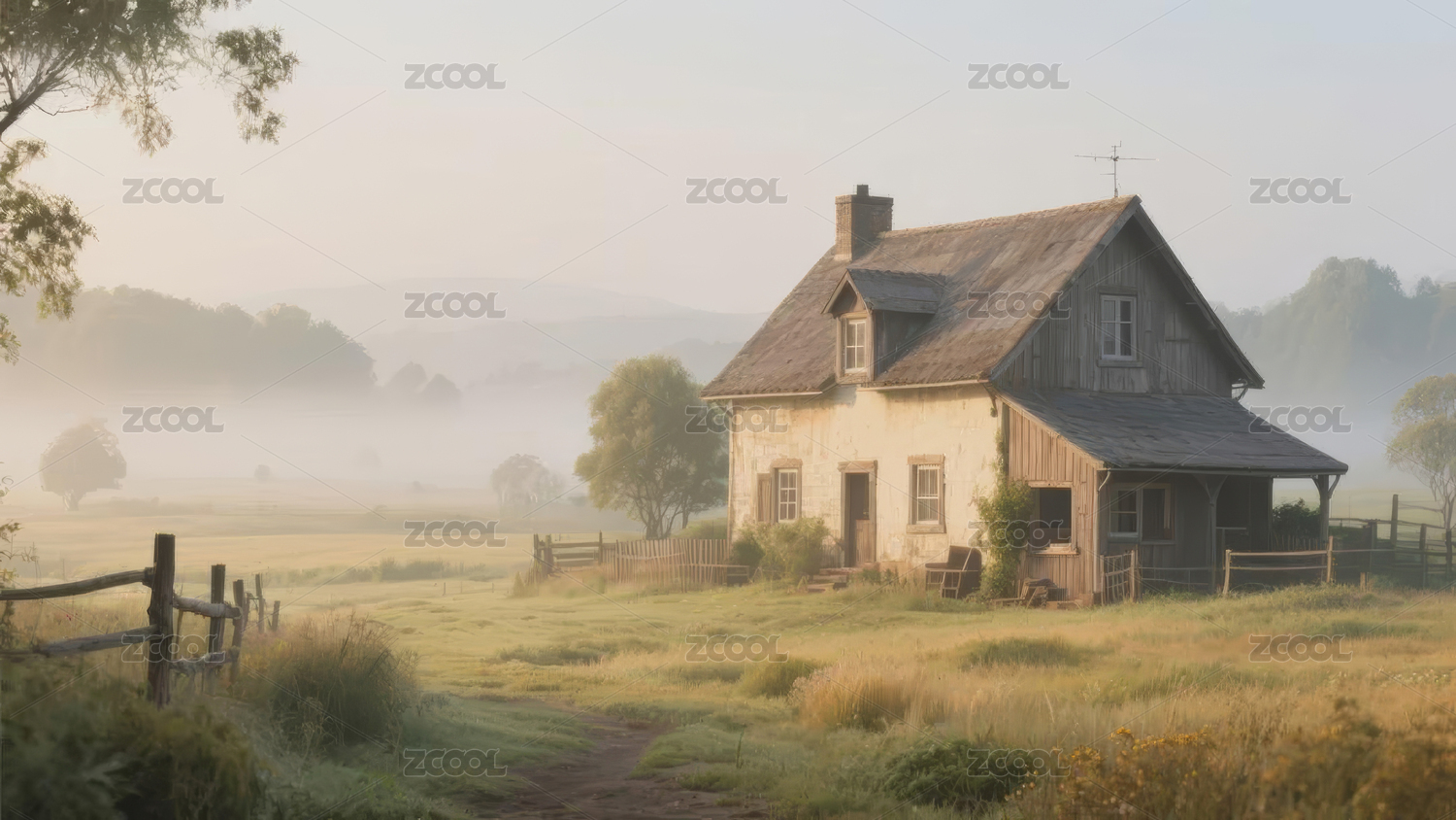 晨雾中的乡村小屋