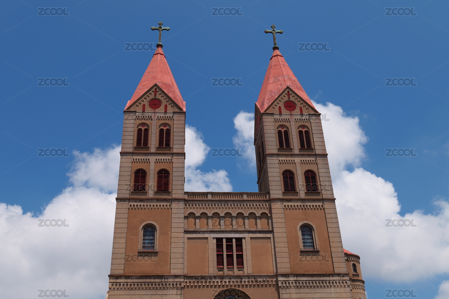 蓝天白云映衬下的青岛天主教堂外部建筑