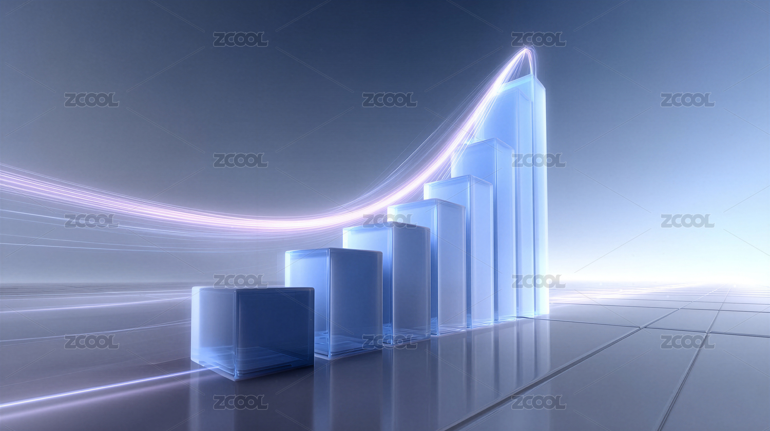 蓝色渐变柱状图与光效曲线展示增长趋势