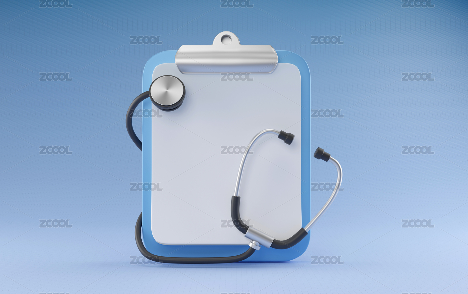 3D蓝色报告夹与听诊器组合健康医疗素材