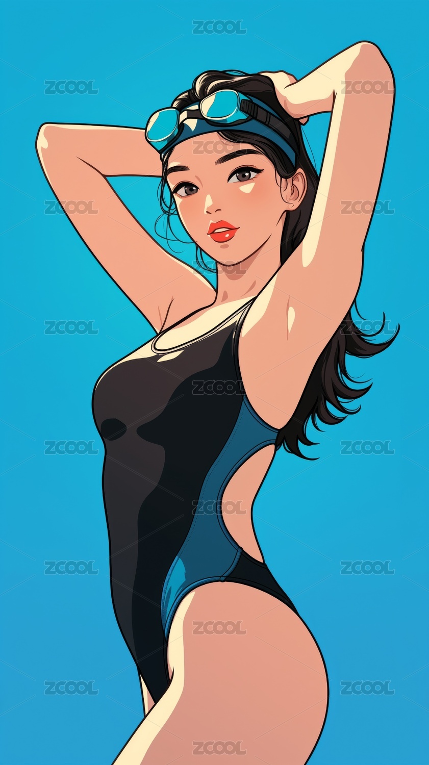 穿泳衣戴泳帽的黑头发东方女性插画绘画