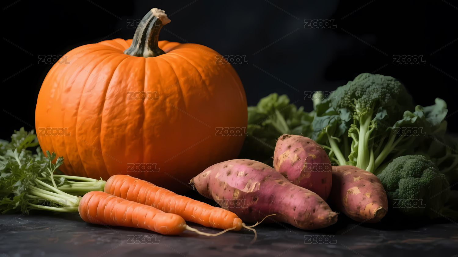 在木质纹理黑色背景下摆放的多种常见蔬菜堆