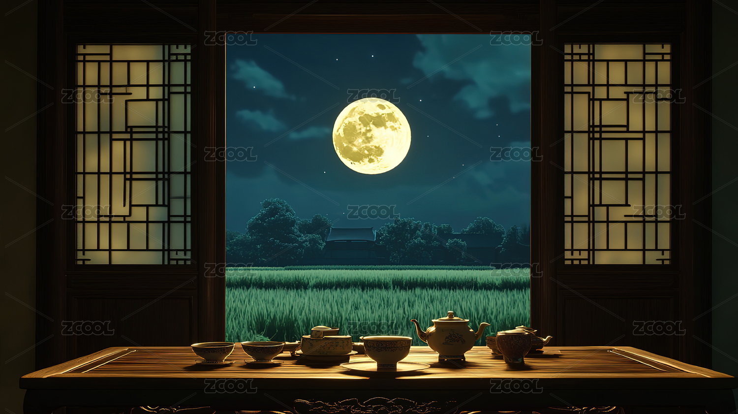 月光下静谧茶室场景
