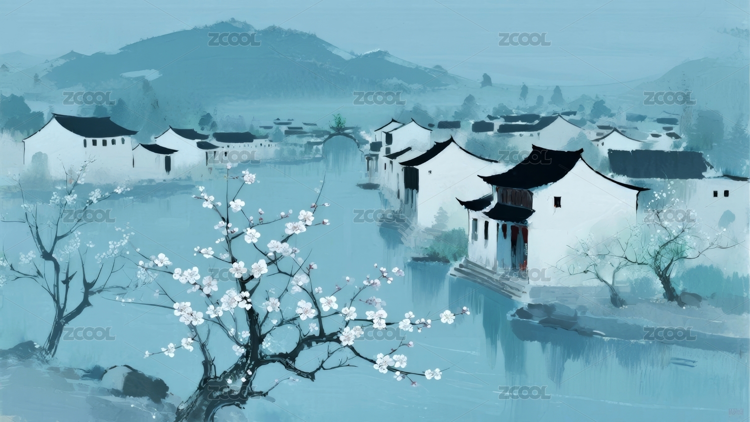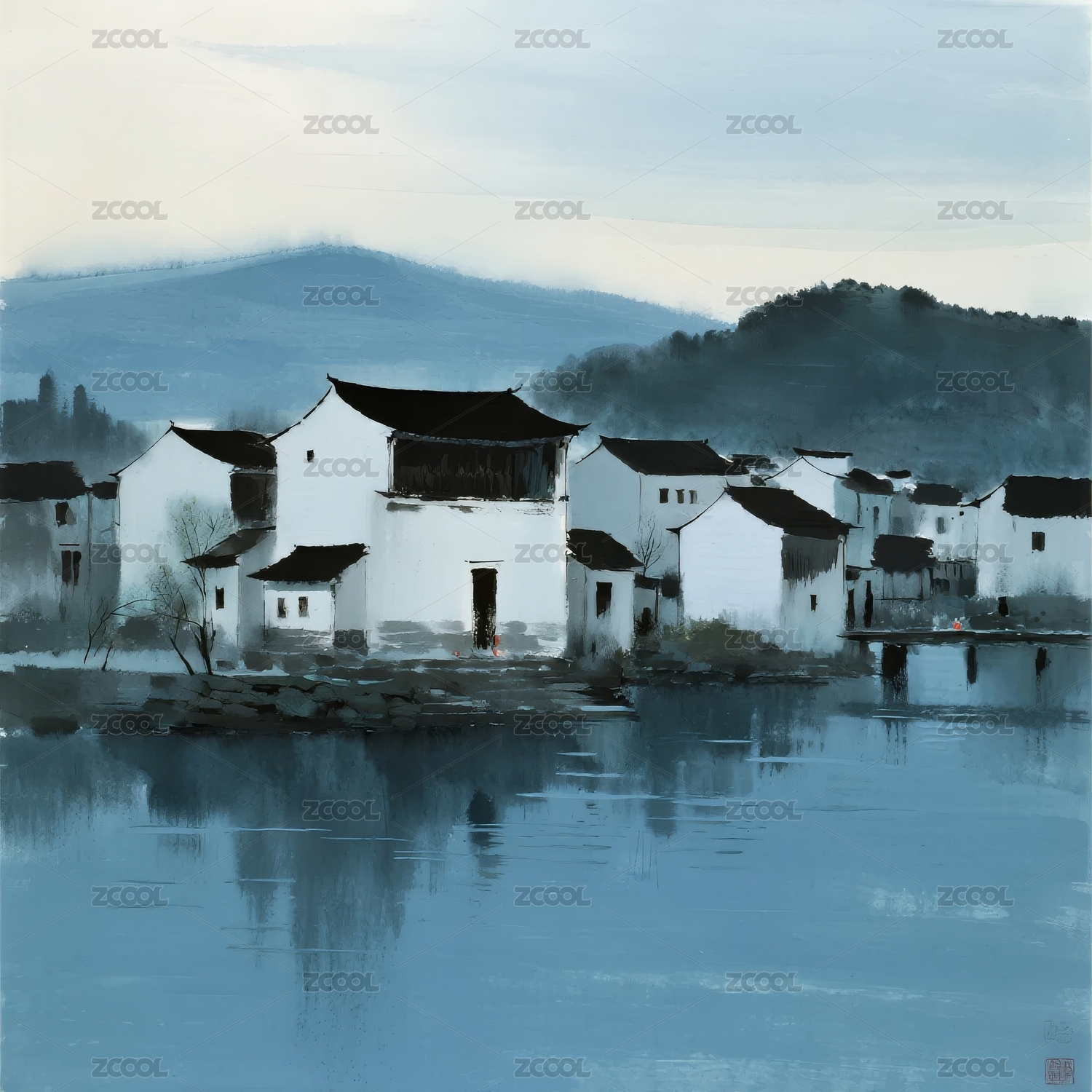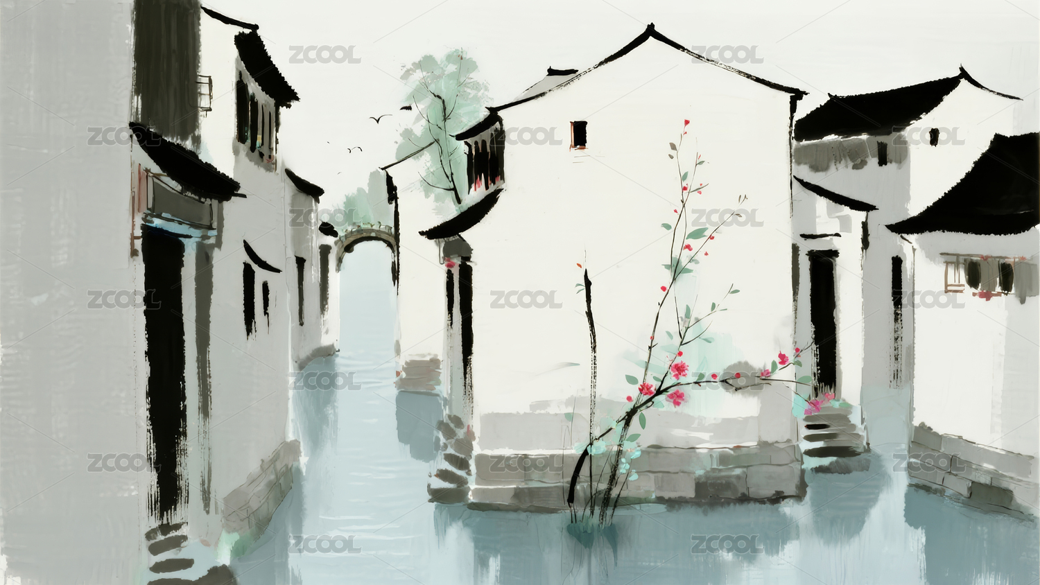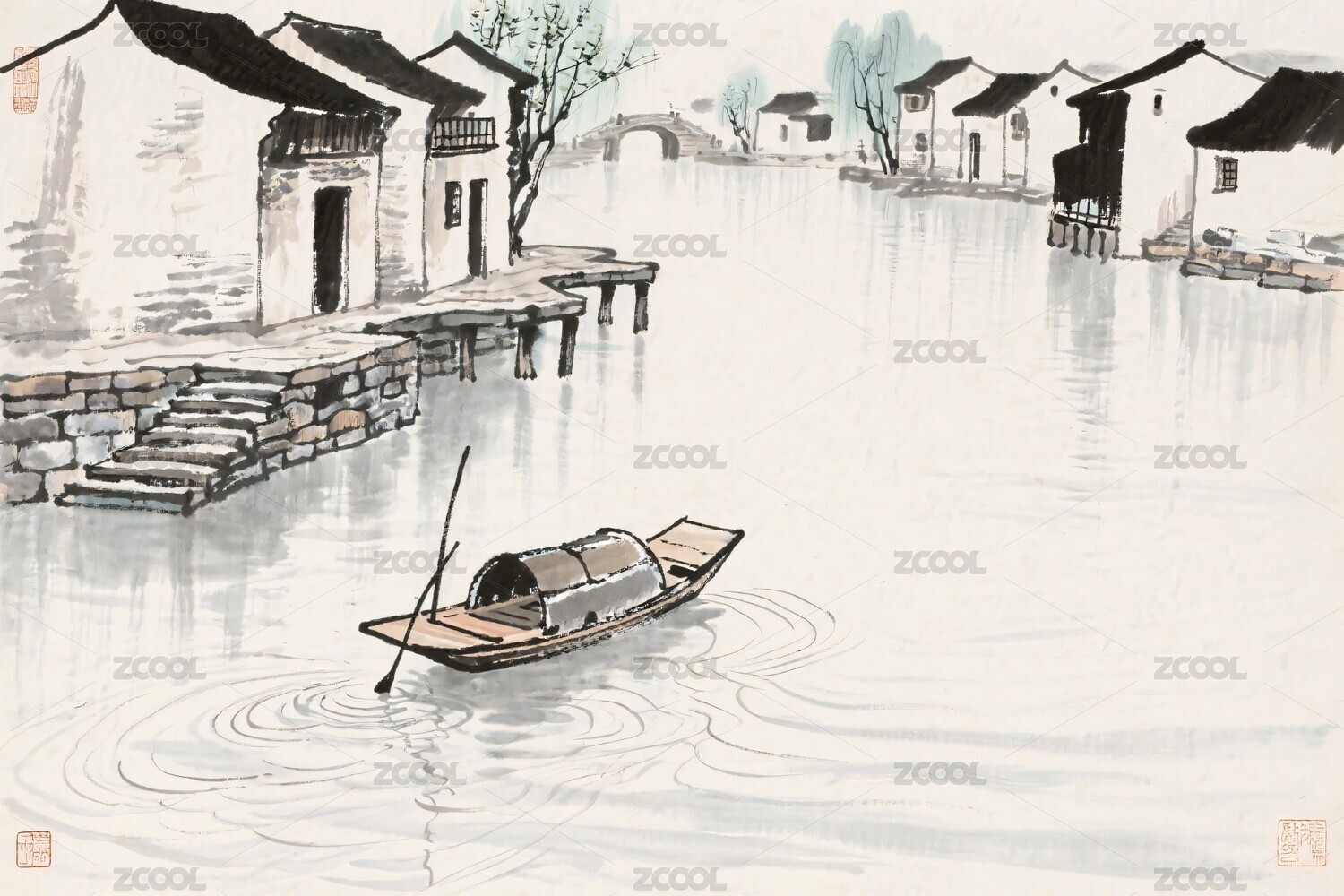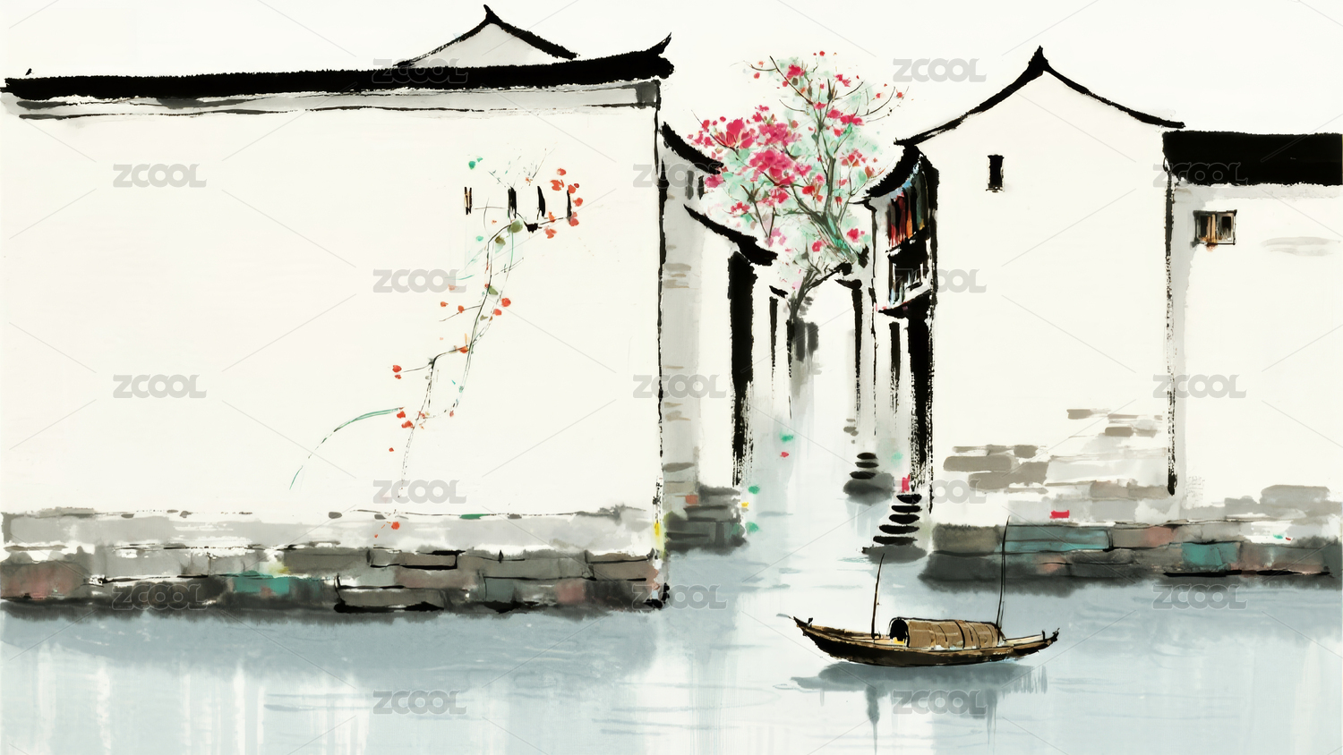 中国画,水墨画,古建筑,意境美,江南风,水乡景,人家屋,白墙灰,瓦屋顶,小船只