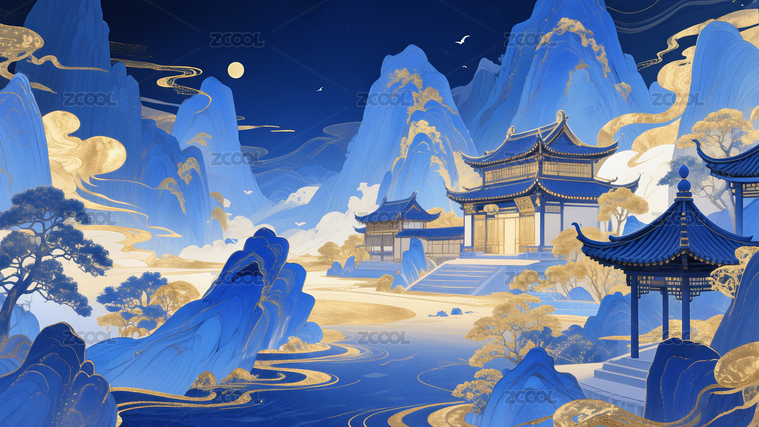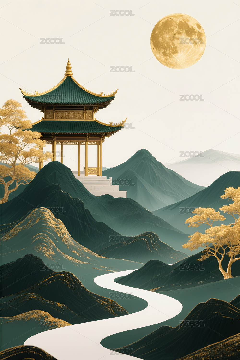 新中式,国风,金箔,3D,立体,月亮,楼阁,山水画,抽象,背景