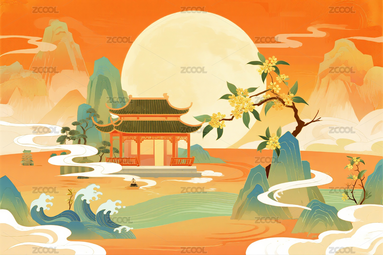 中秋节山水满月插画