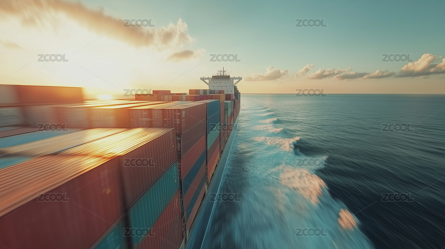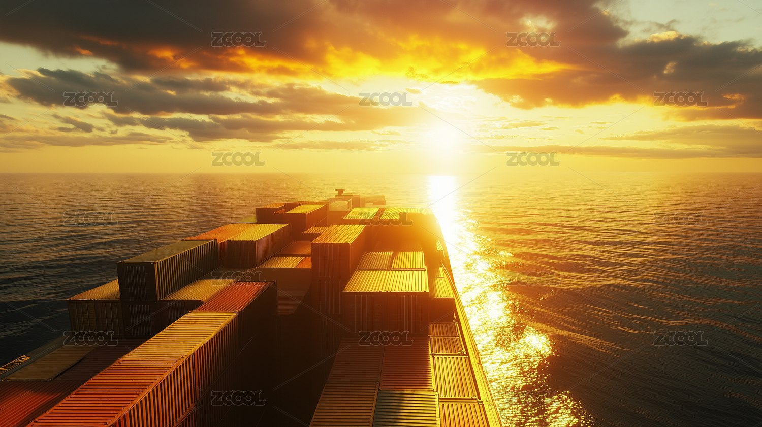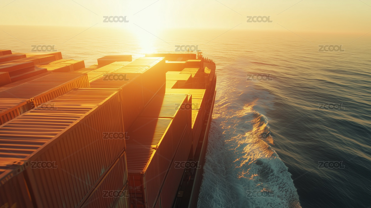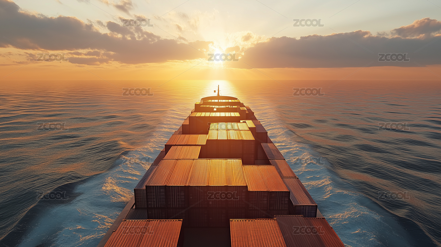 夕阳下大海中正在行驶的货轮特写