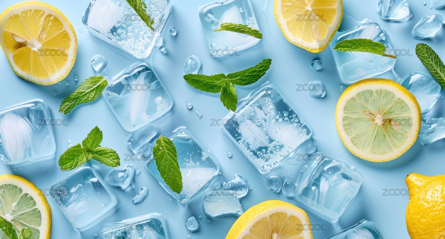 柠檬与冰块蓝色背景