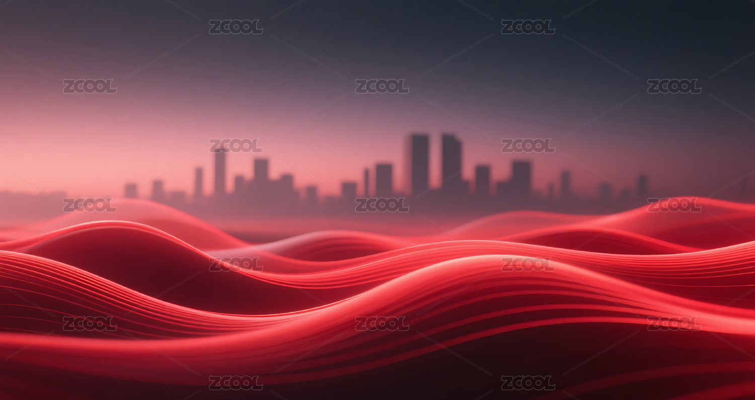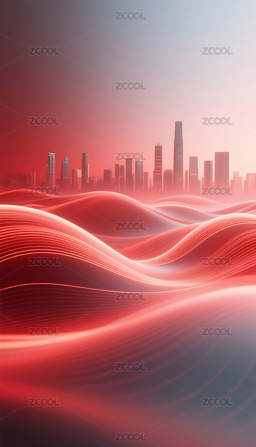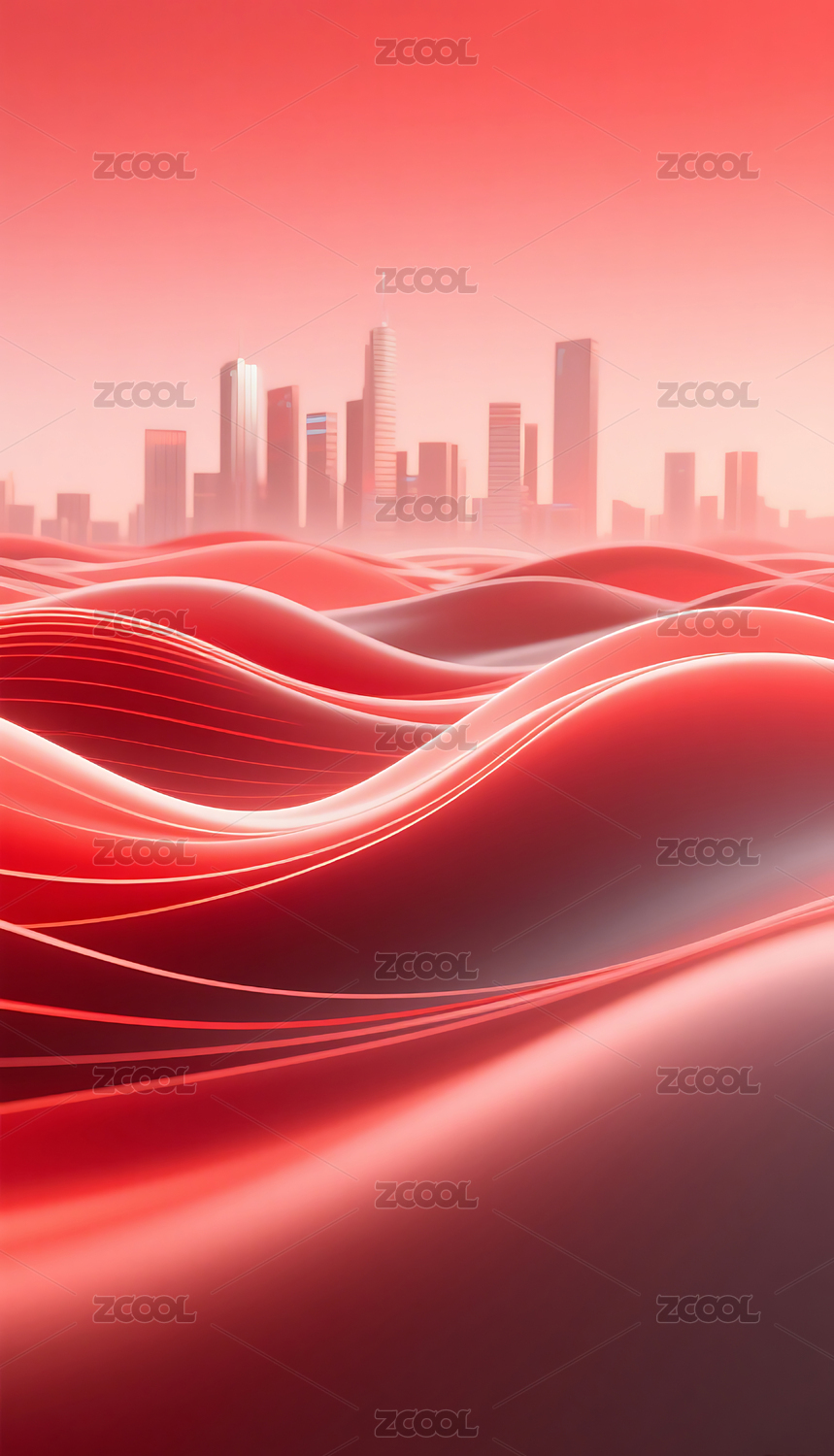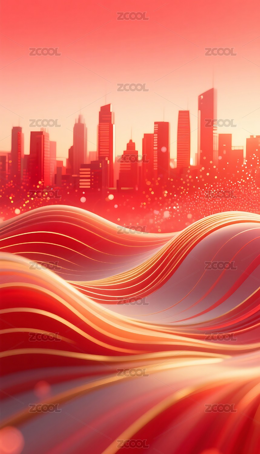 流畅的红金色渐变波浪线条玻璃城市建筑