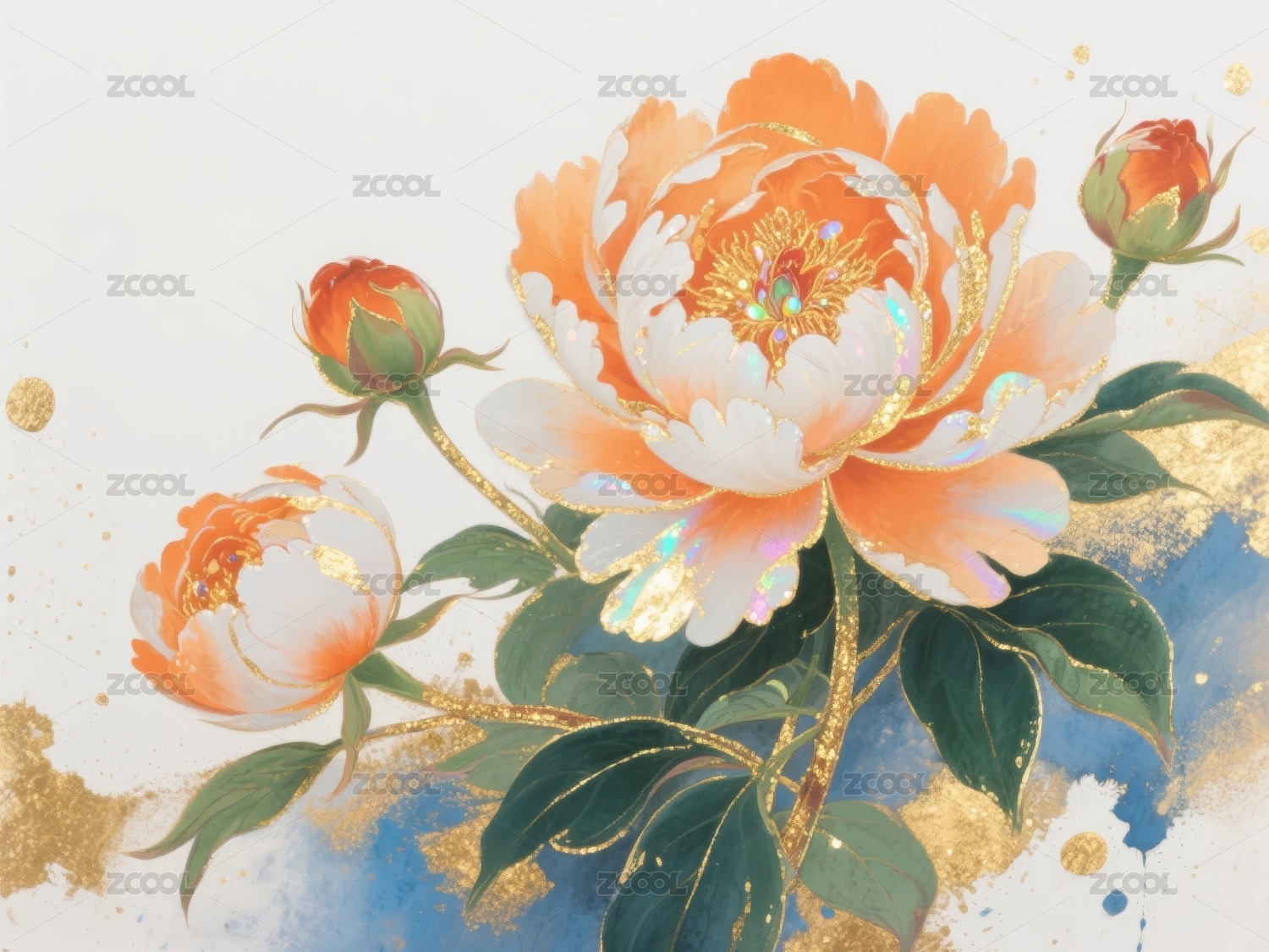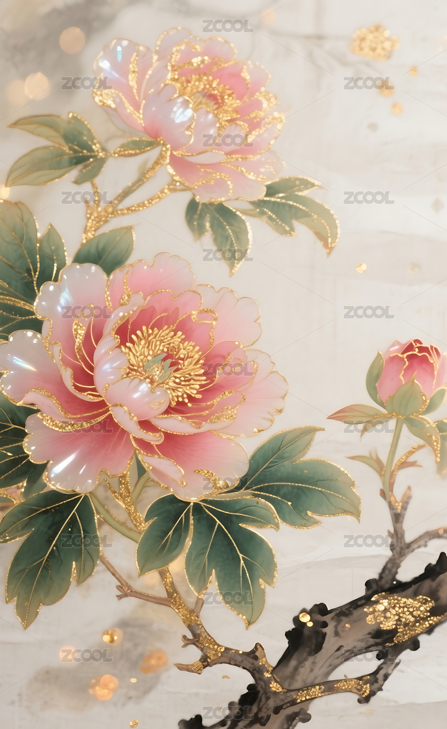 牡丹,花卉,国风,水墨风,红色,金色,花瓣,花蕾,绿叶,艺术