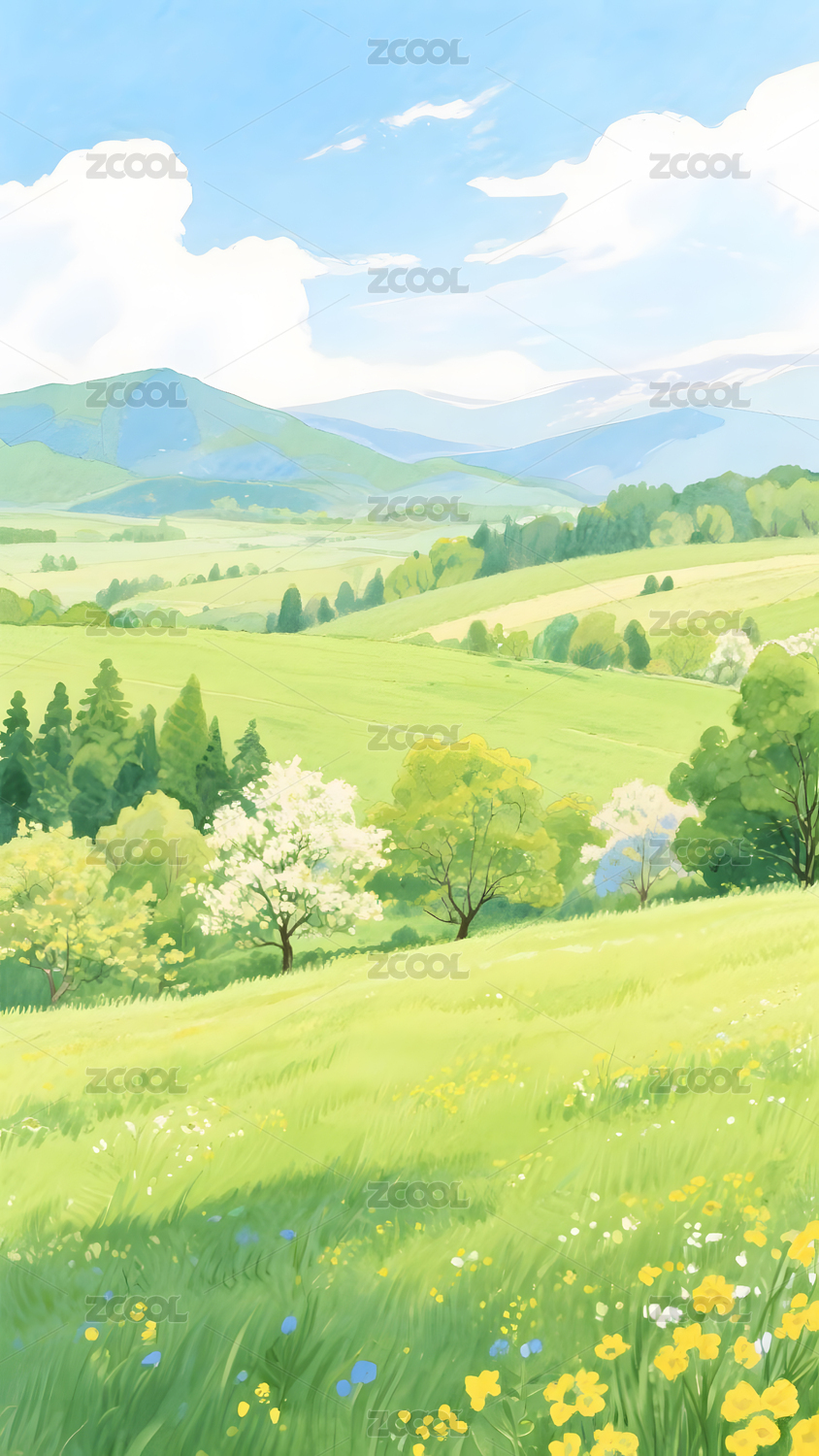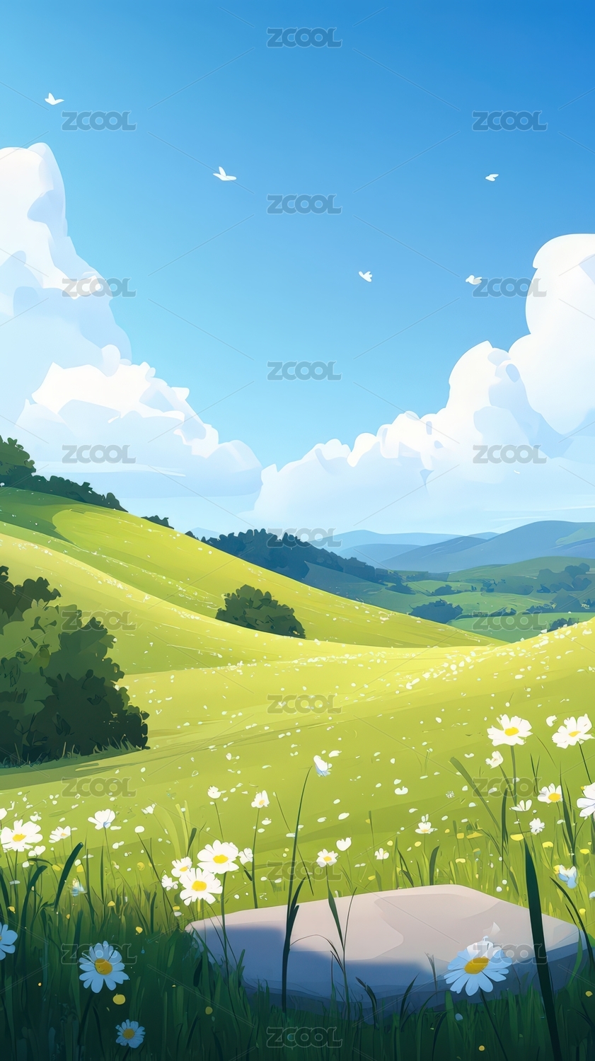 绿色,草地,花朵,蓝天,白云,树木,山丘,自然,清新,明媚