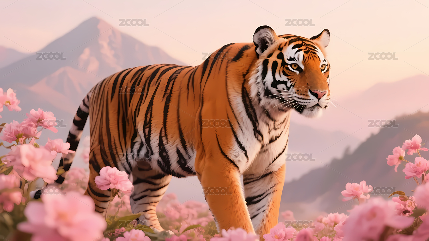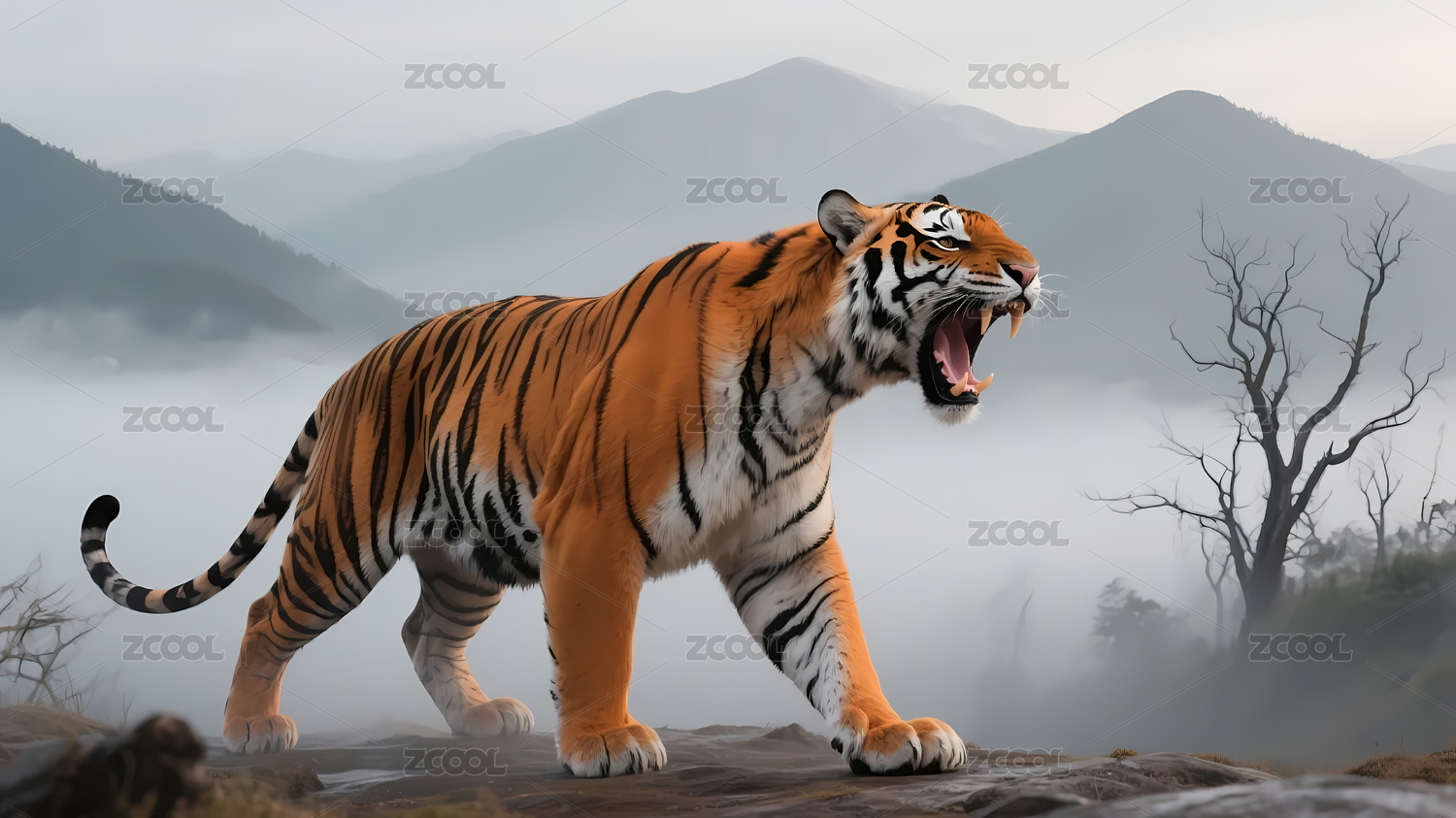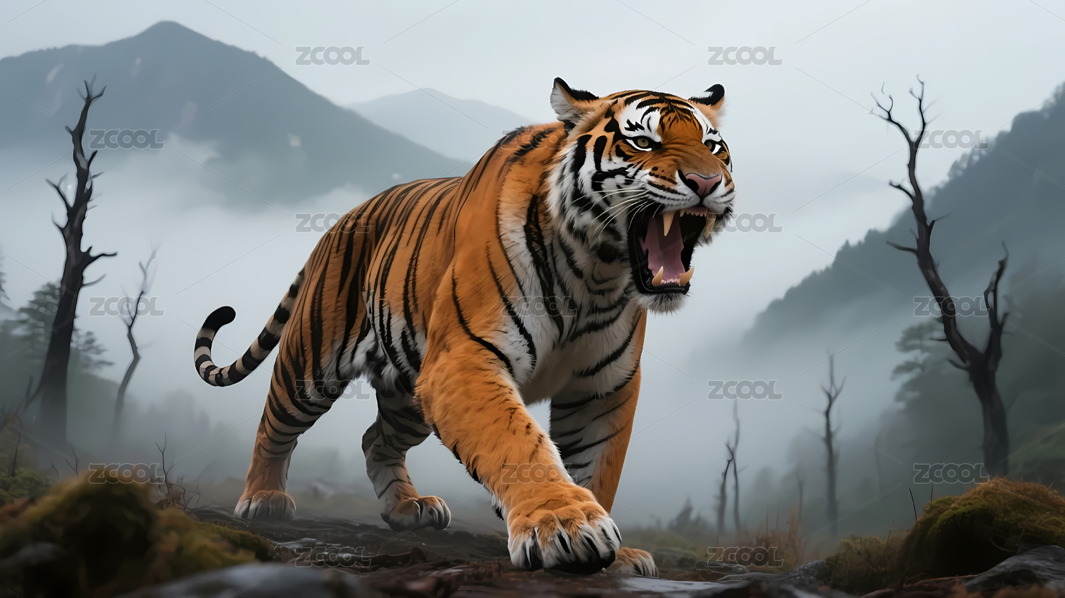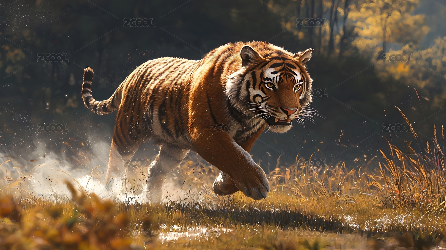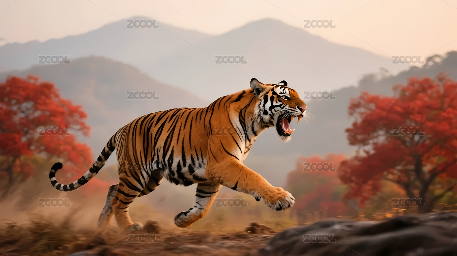 条纹,自然,橙色,黑色,山脉,秋天,老虎,奔跑,山间,红叶