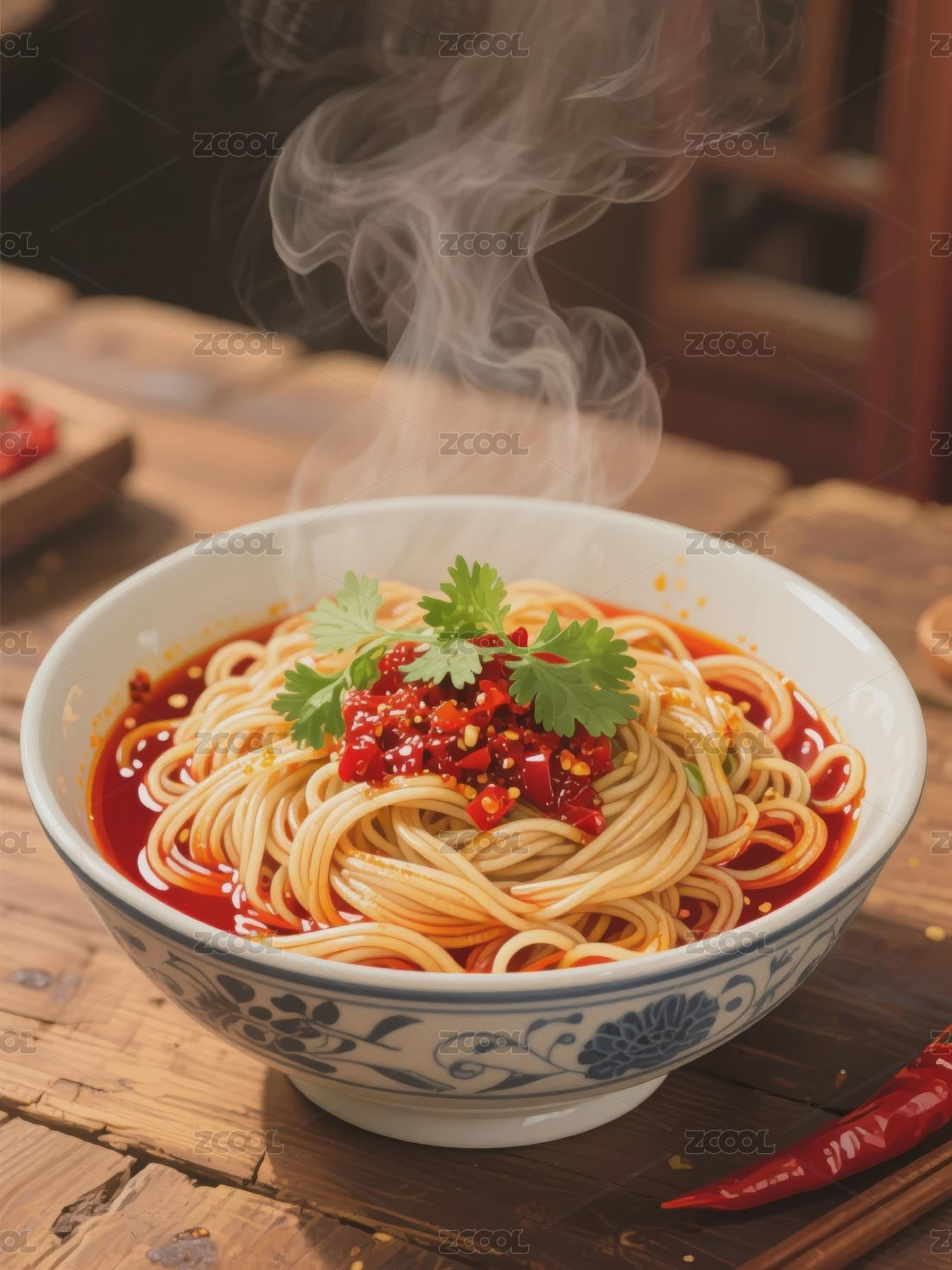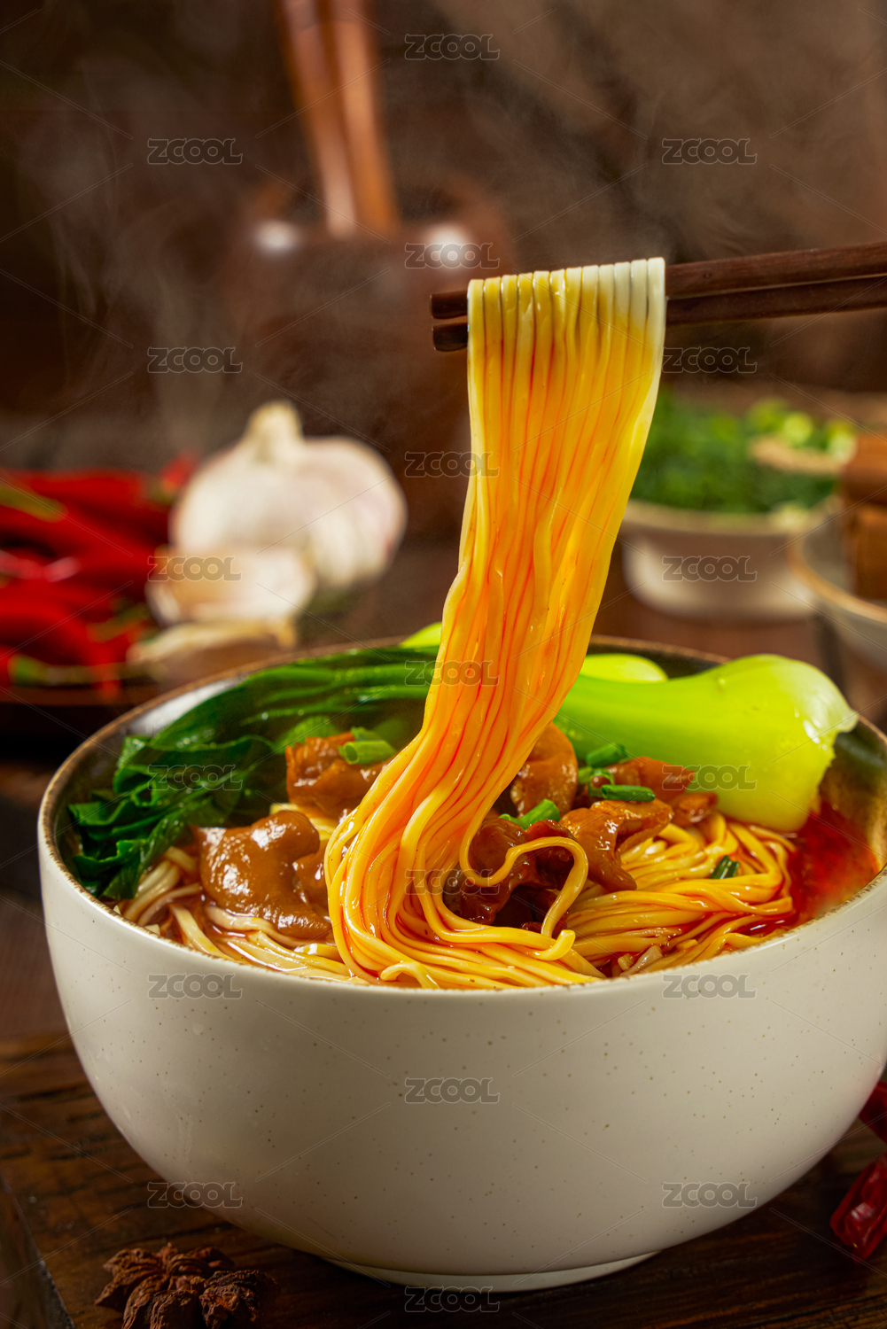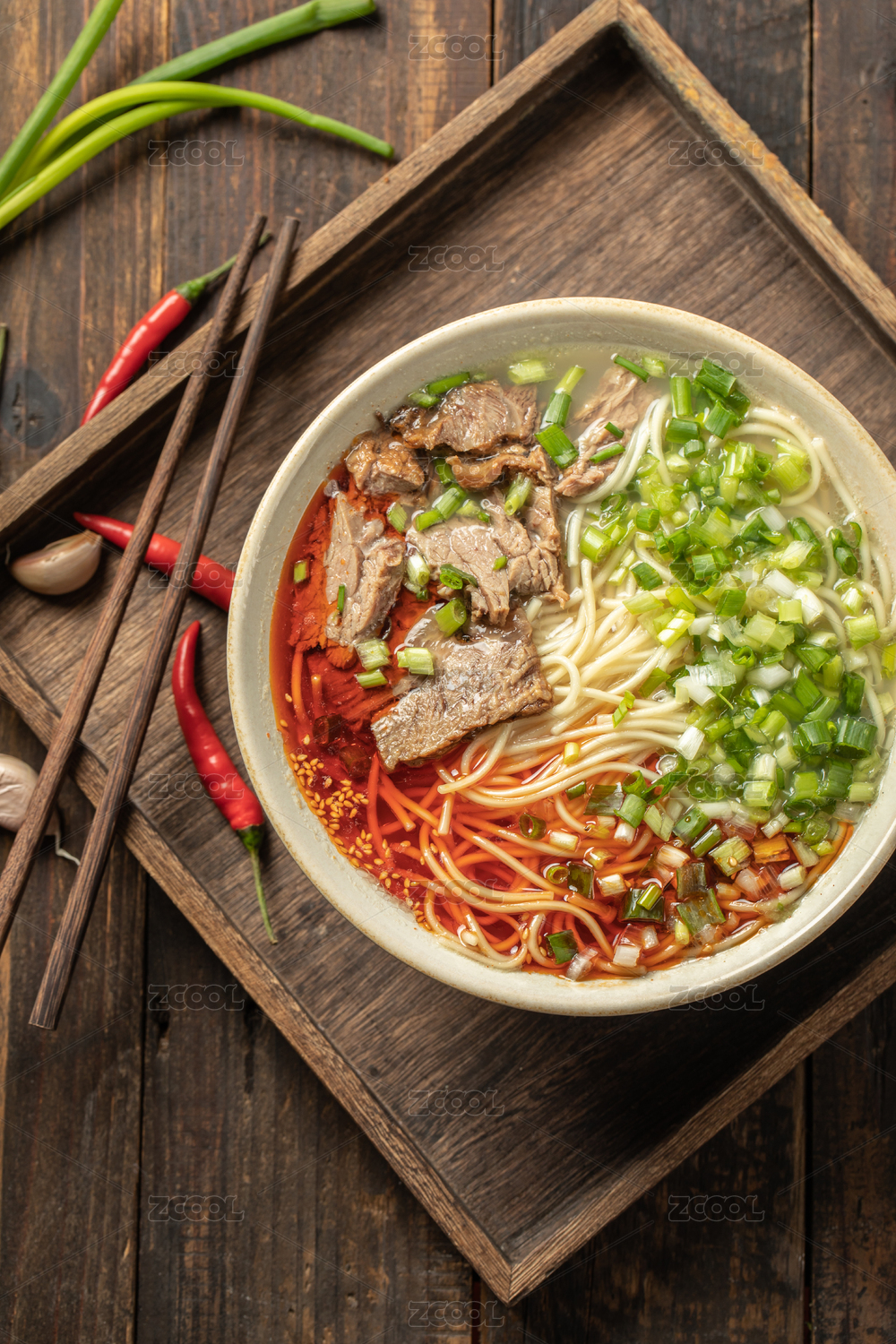 木桌上一碗香辣的红汤牛肉面的竖构图