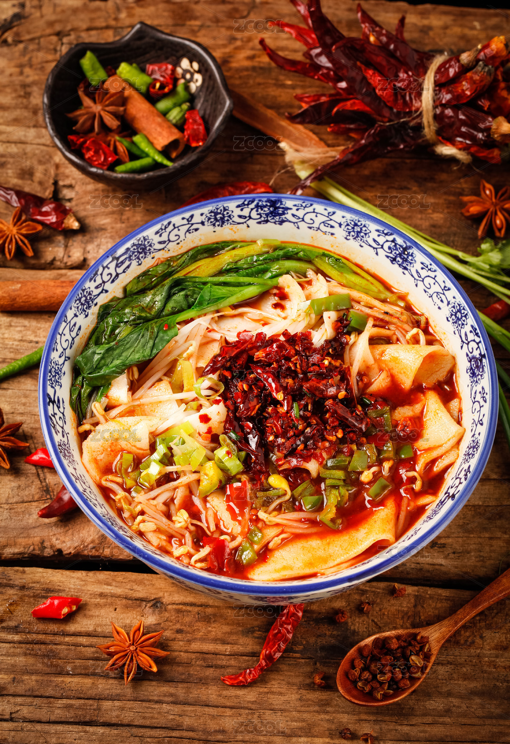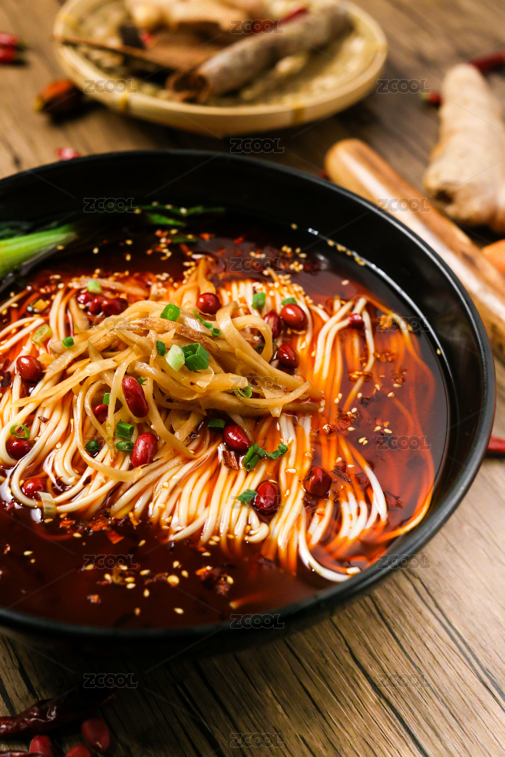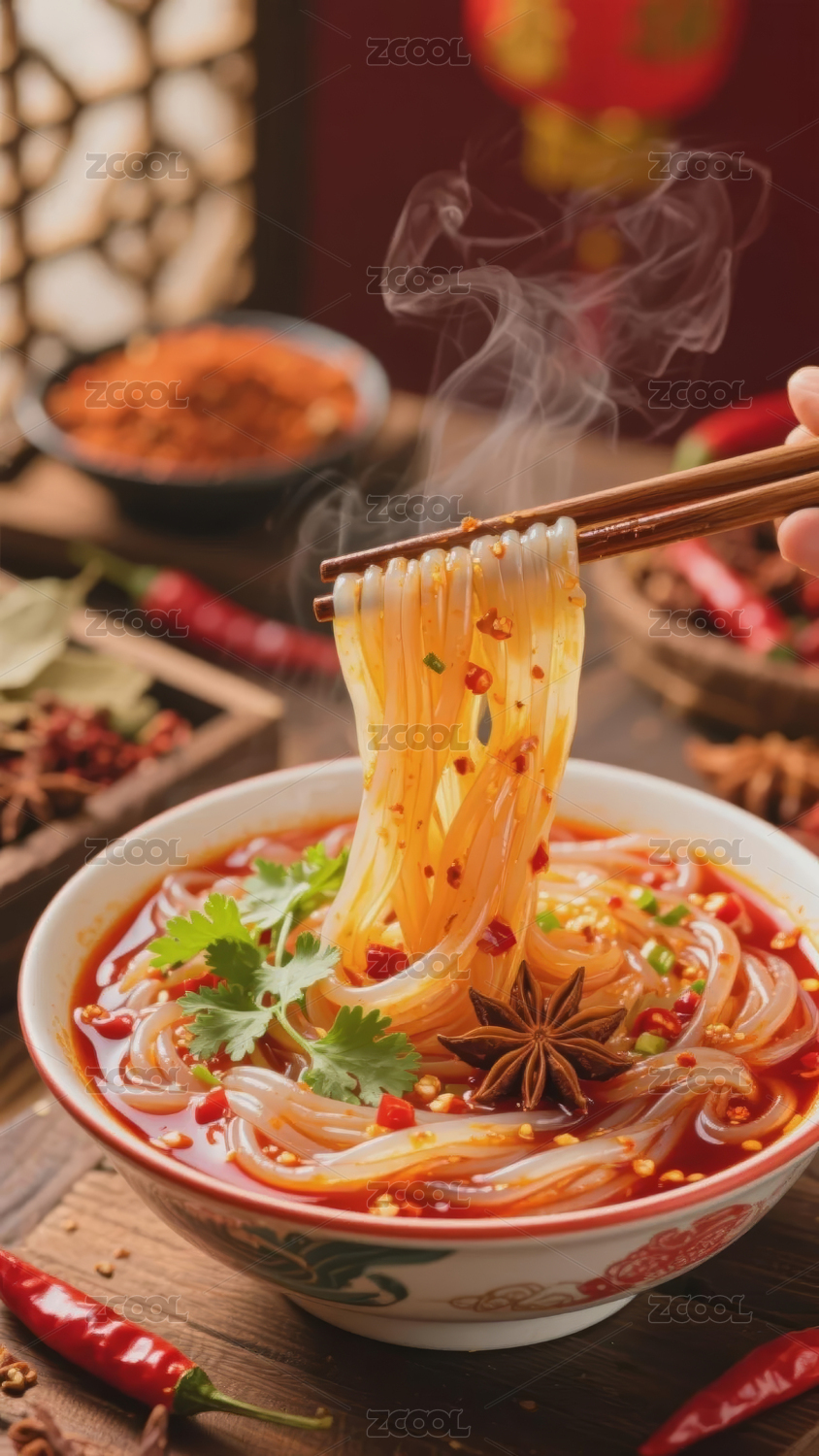 木桌上一碗香辣的红汤牛肉面的竖构图