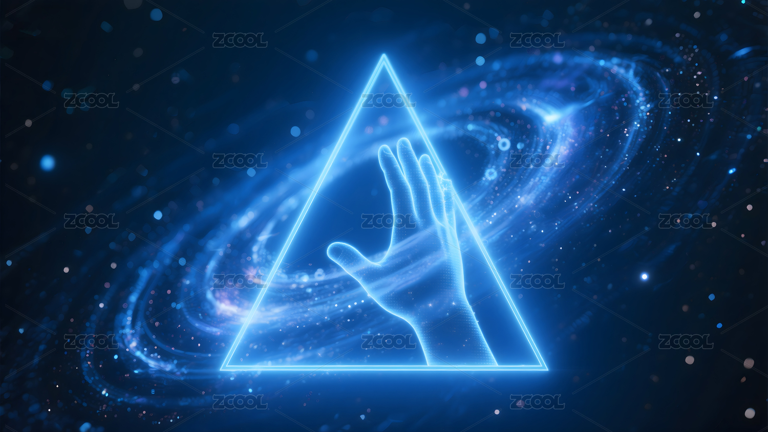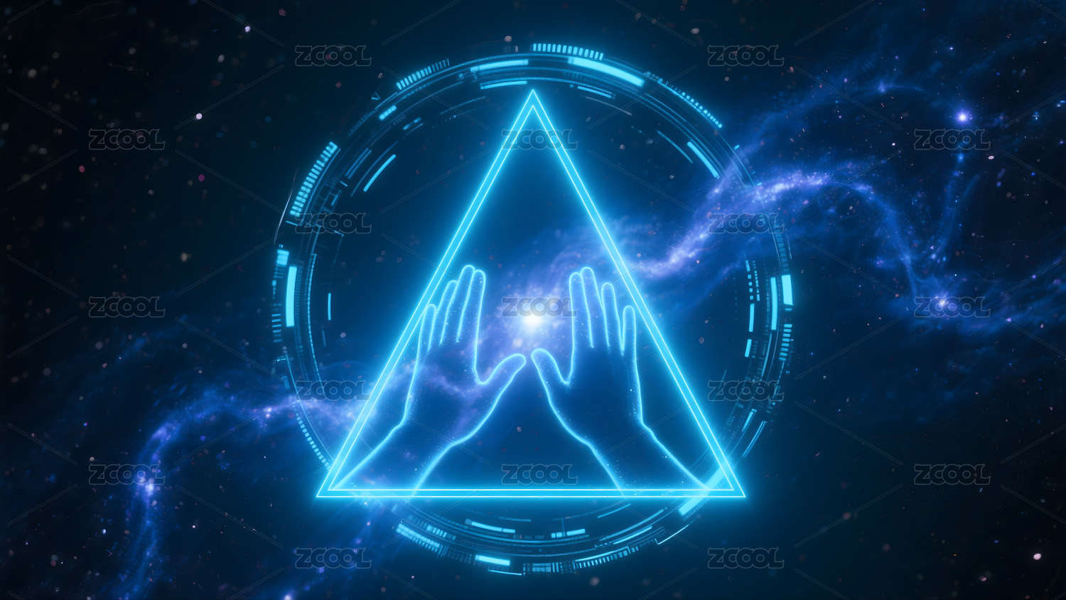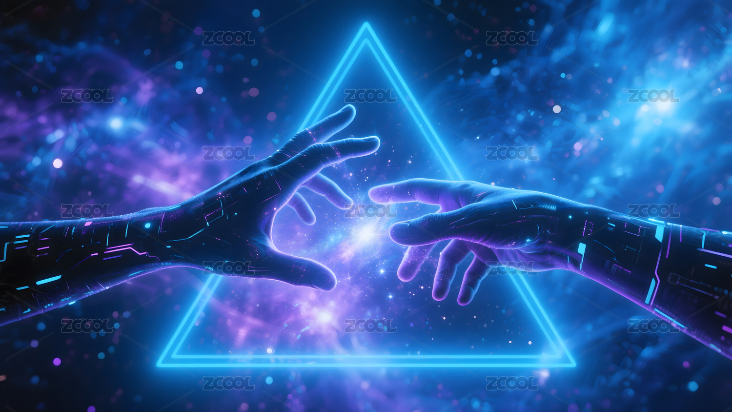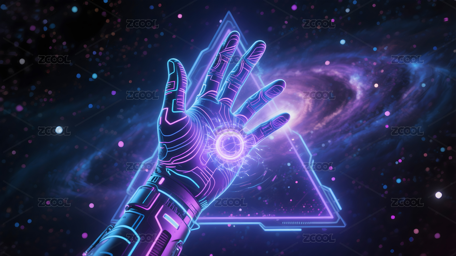 赛博朋克,未来,科技,三角形,能量,机械手,宇宙,星空,发光,霓虹