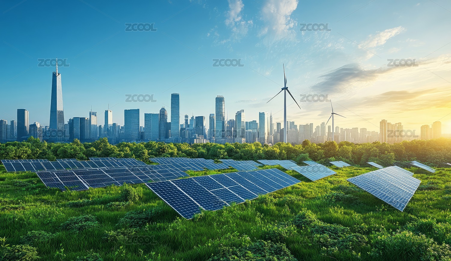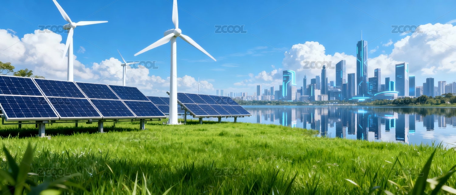 城市,草地,太阳能板,风力发电机,绿植,新能源,城市建筑,自然风光,风力发电,能源