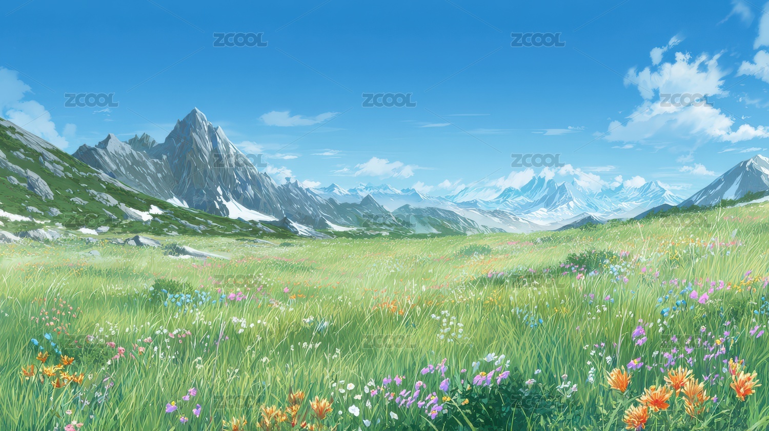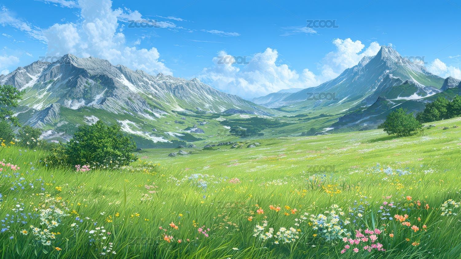 蓝天,白云,绿植,花海,山峰,草地,溪流,野花