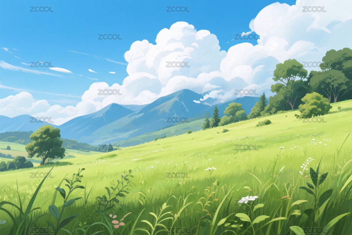 清新明亮绿色辽阔草原起伏的雪山插画绘画
