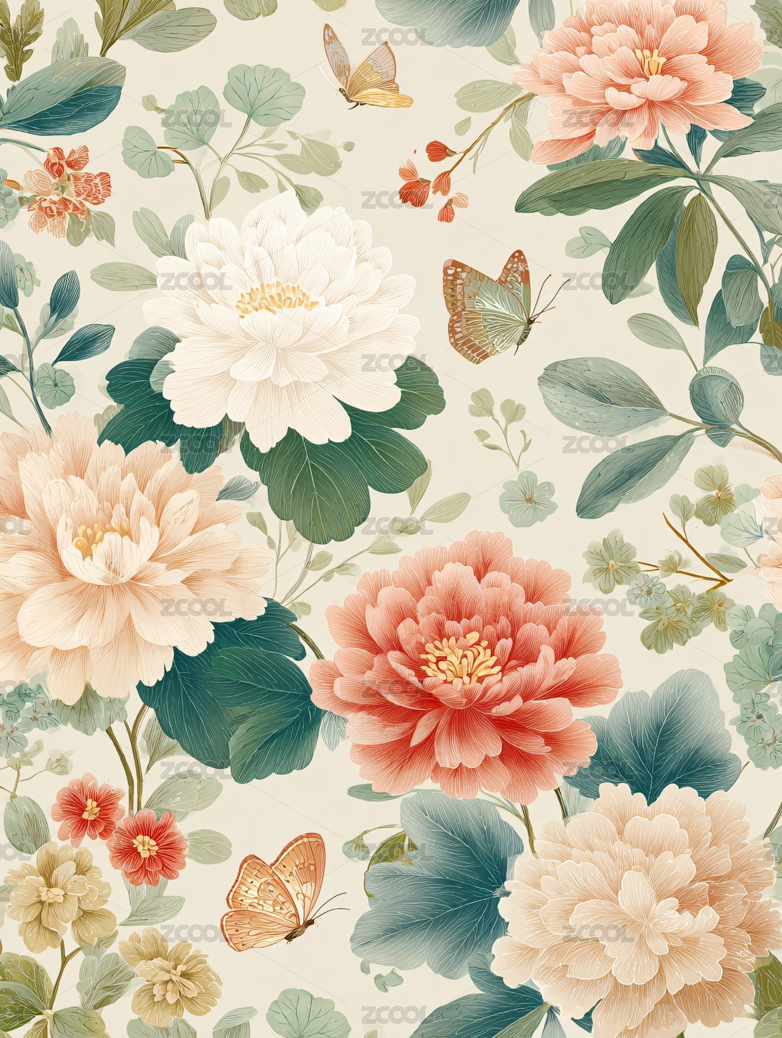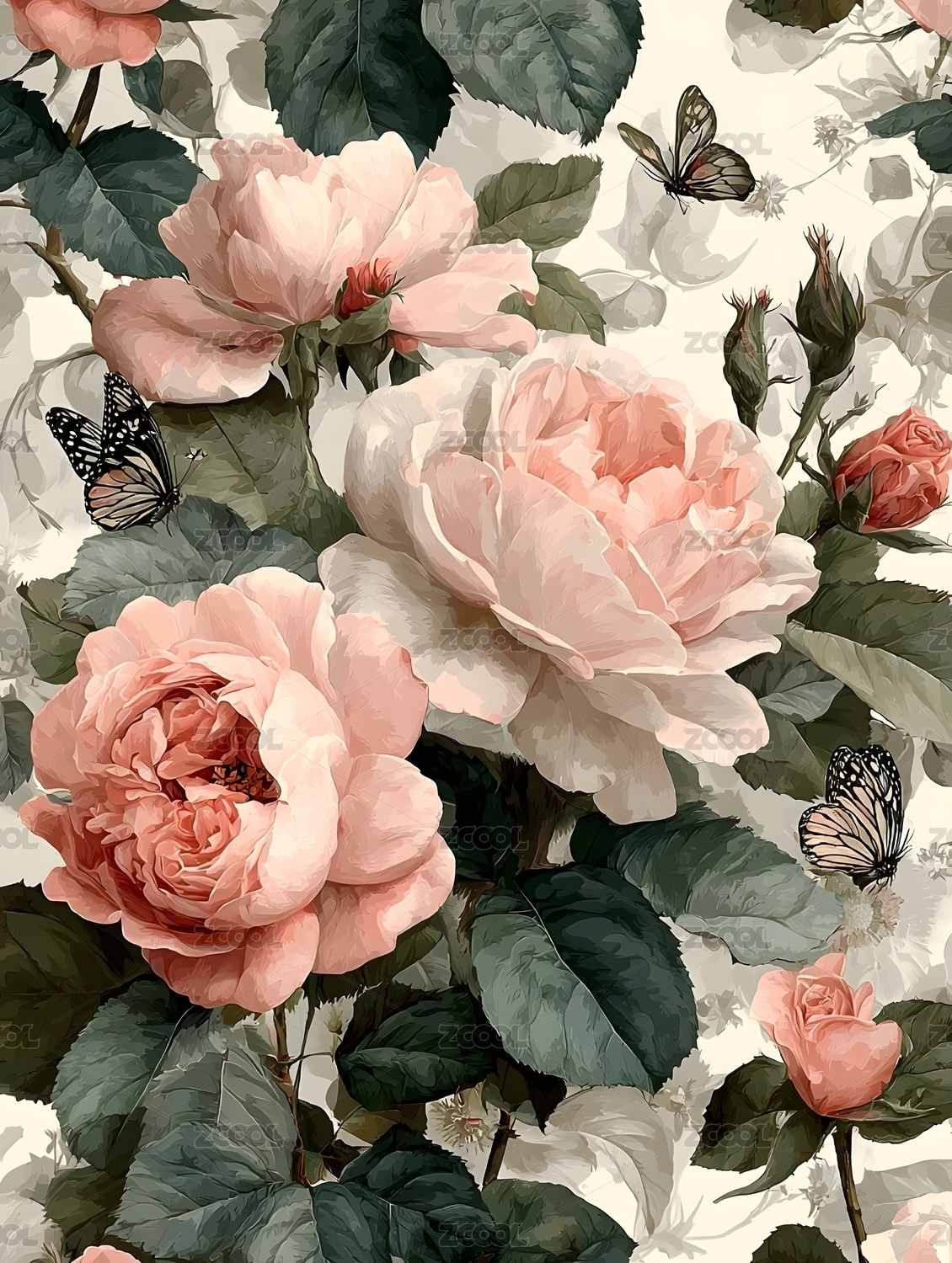 玫瑰,蝴蝶,花卉,图案,插画,背景,花朵,绿叶,粉色,柔美