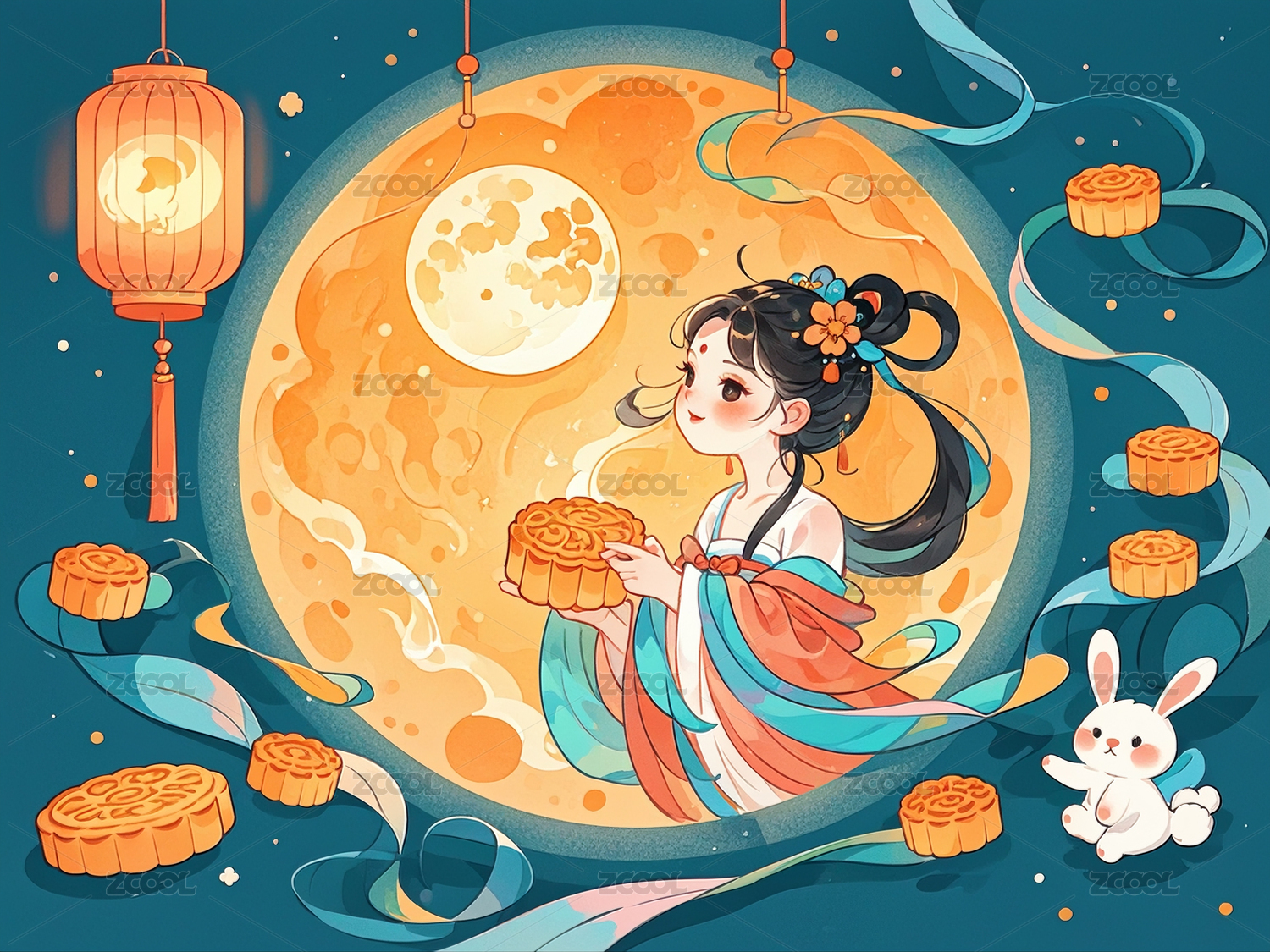 卡通可爱中秋月亮嫦娥月饼节日插画